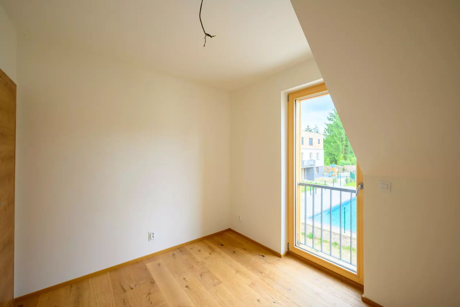Spodní byt (55 m2) má krásnou terasu s předzahrádkou. Z horního bytu (62 m2) je krásný výhled na bazén, který je umístěn přímo před domem.