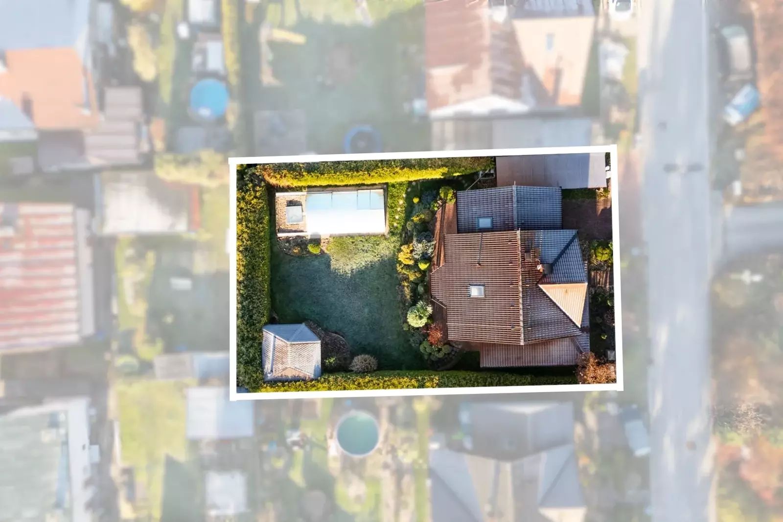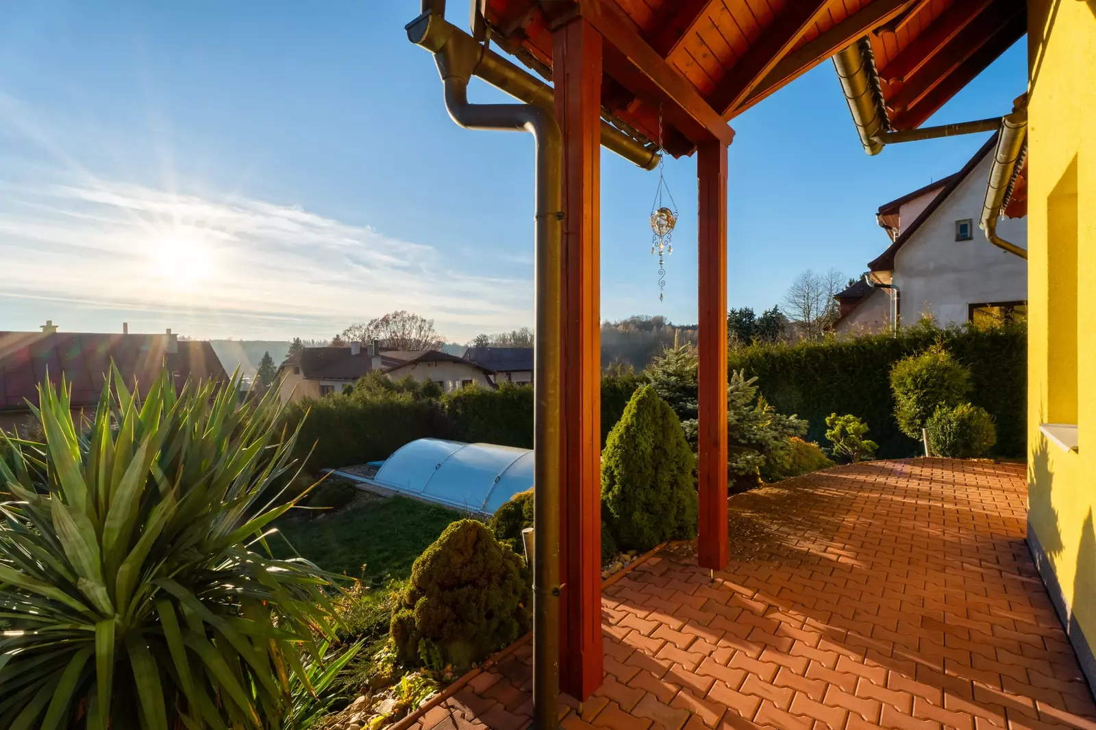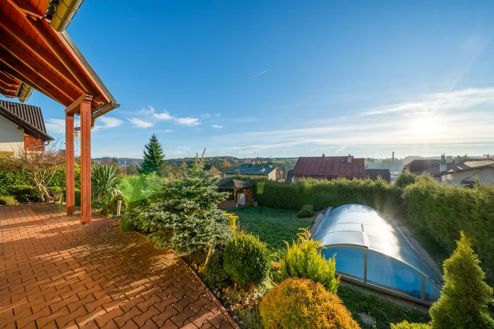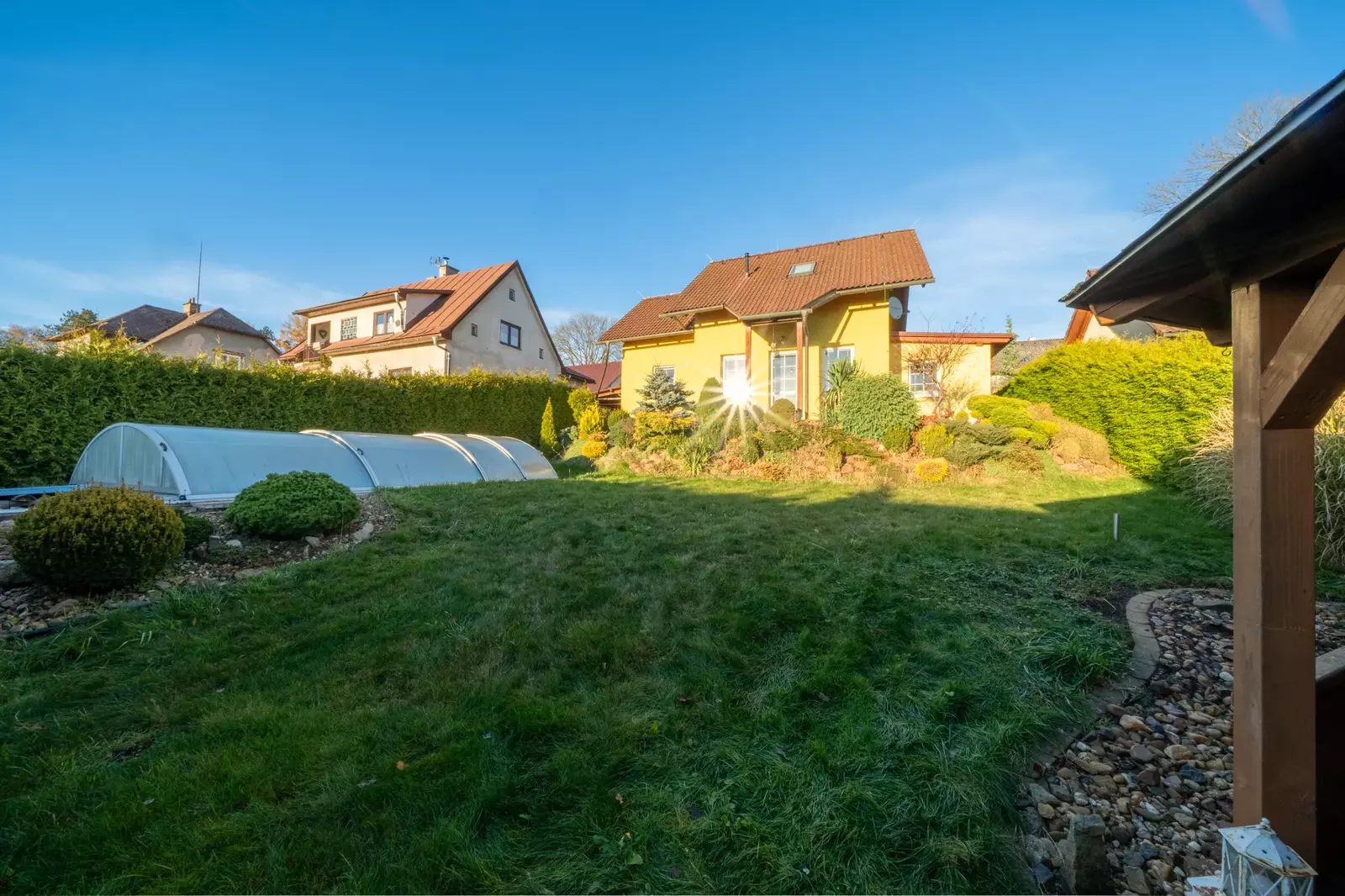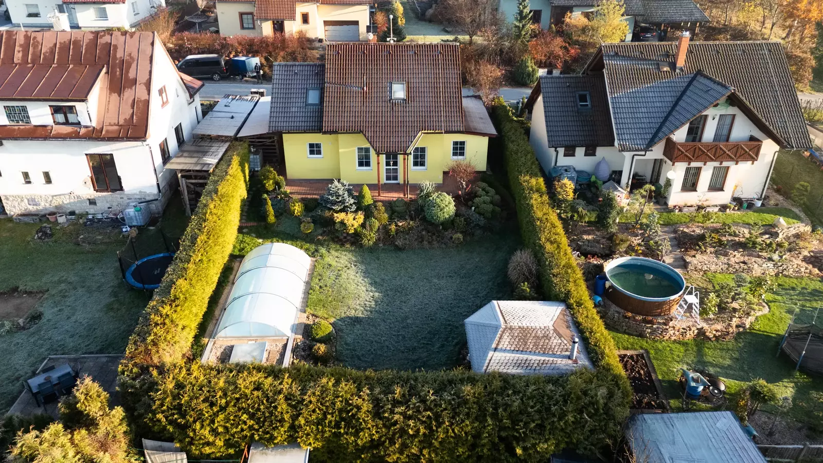 Pozemek, na kterém dům stojí, má výměru 505 m², z čehož 411 m² tvoří překrásně upravená zahrada, která zajišťuje dostatek soukromí a prostoru pro relaxaci i venkovní aktivity Na zahradě domu je terasa, na kterou se dostanete přímo z obývacího pokoje, venkovní kryté posezení a venkovní bazén.
