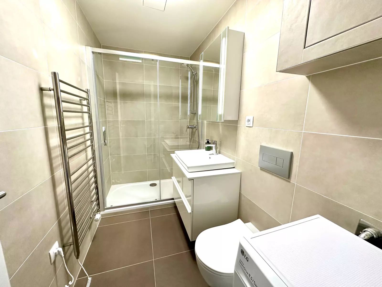 Koupelna má prostorný sprchovací kout, umyvadlo, WC.