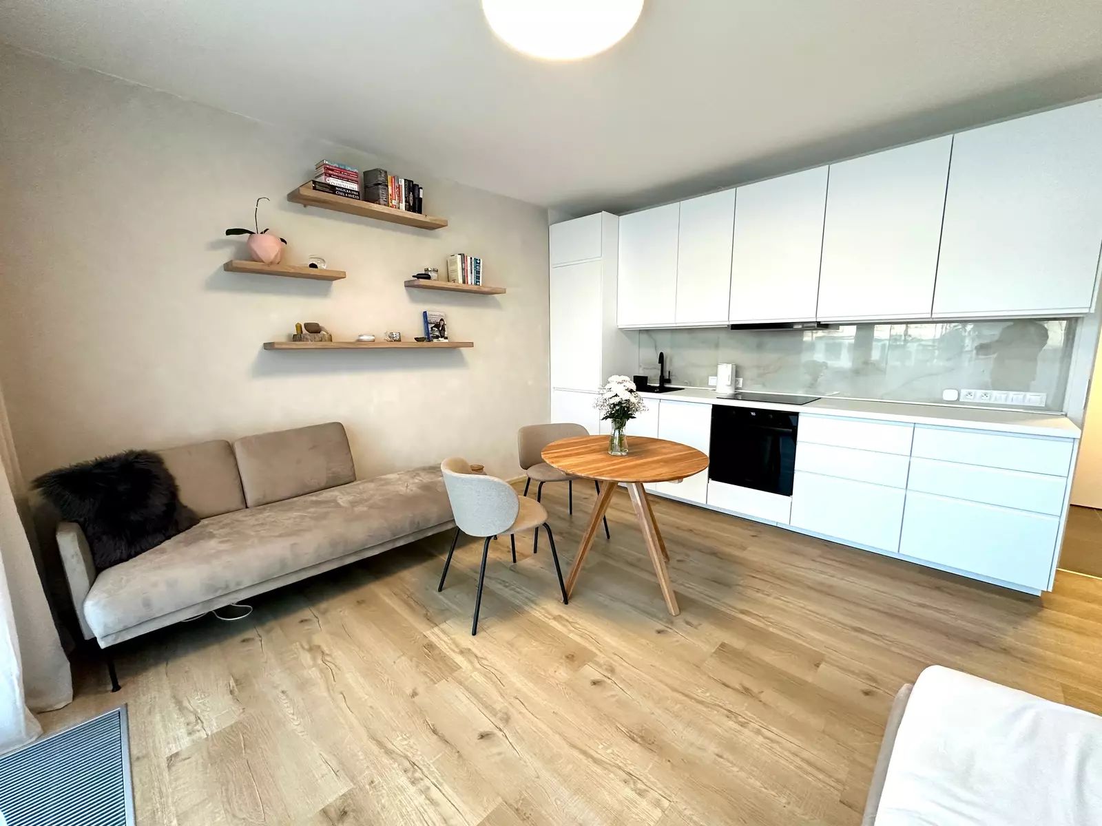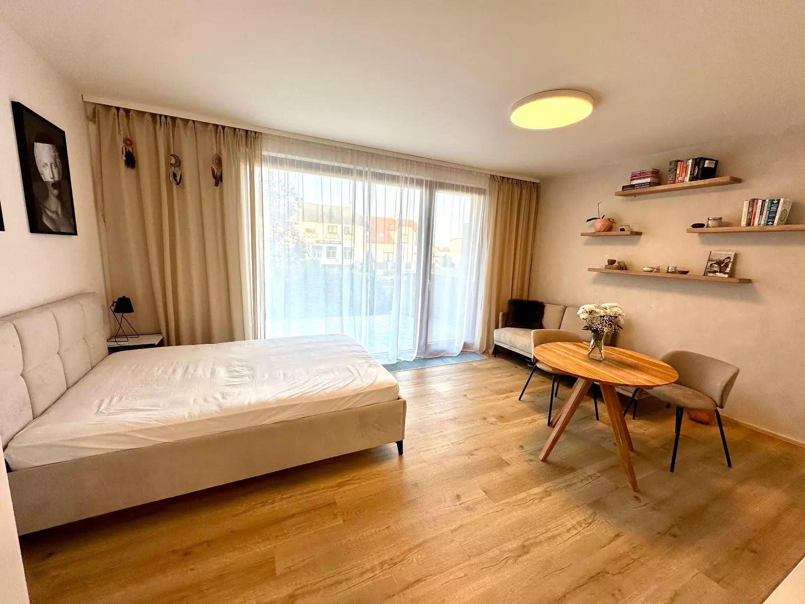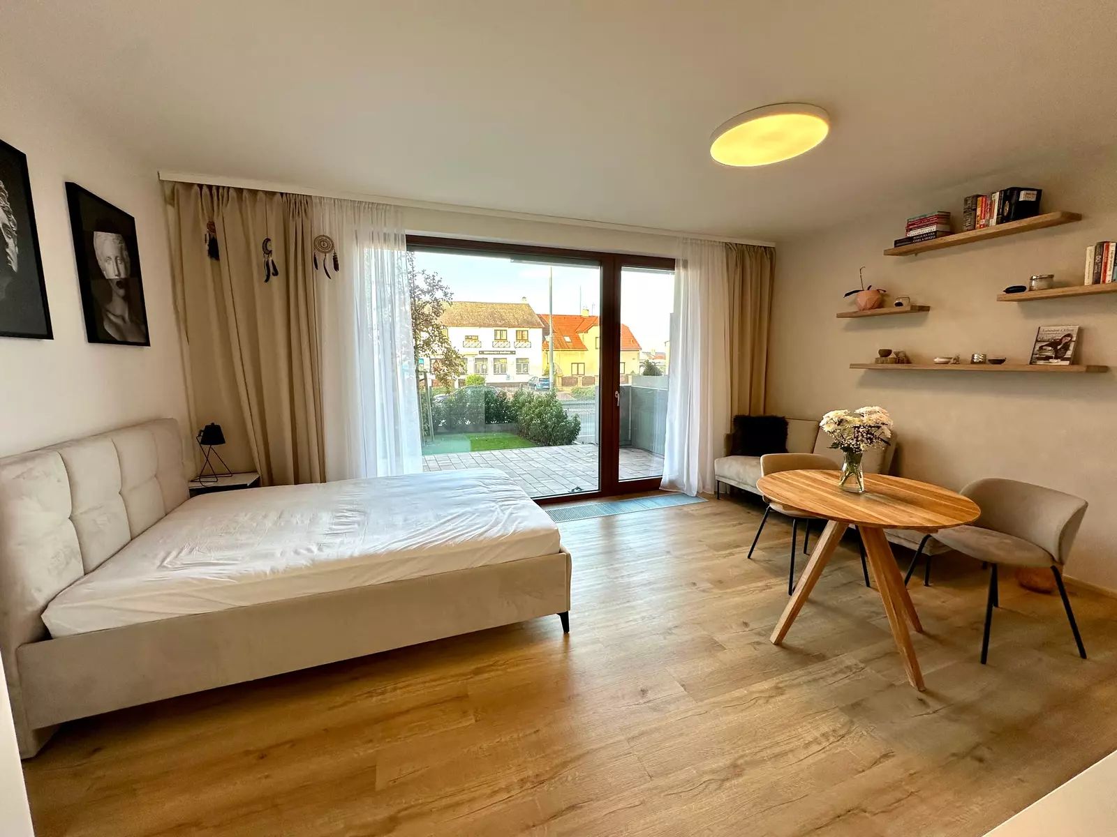 Obývací prostor tohoto bytu je světlý s moderními francouzskými okny a vstupem na terasu.