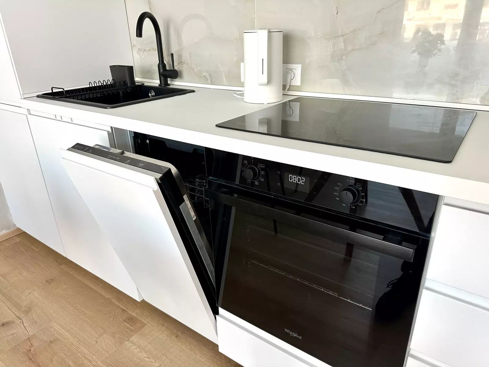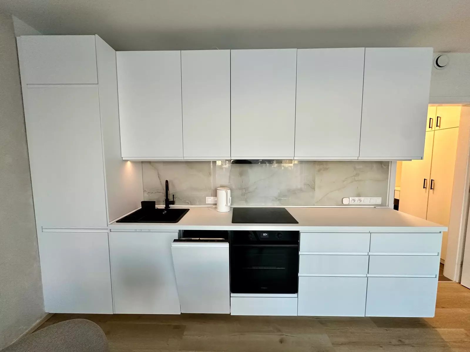 Kuchyňská linka je vybavená spotřebiči (lednice, myčka, trouba a varná deska, mikrovlnka).