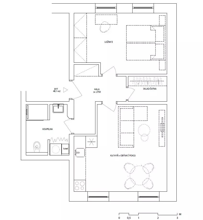 Byt se nachází v 1. patře zděného domu a prošel kompletní rekonstrukcí. Dispozičně je řešen velmi prakticky – obývací pokoj s kuchyňským koutem, samostatná ložnice, koupelna, šatna a chodba. K bytu náleží také komora na společné chodbě a velká půda přímo nad bytem.