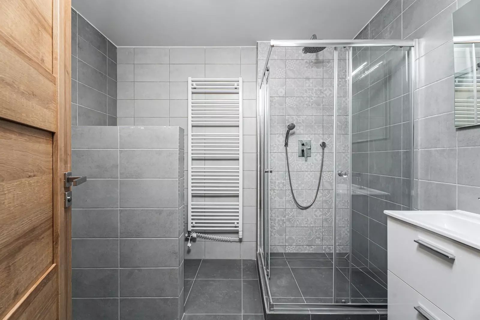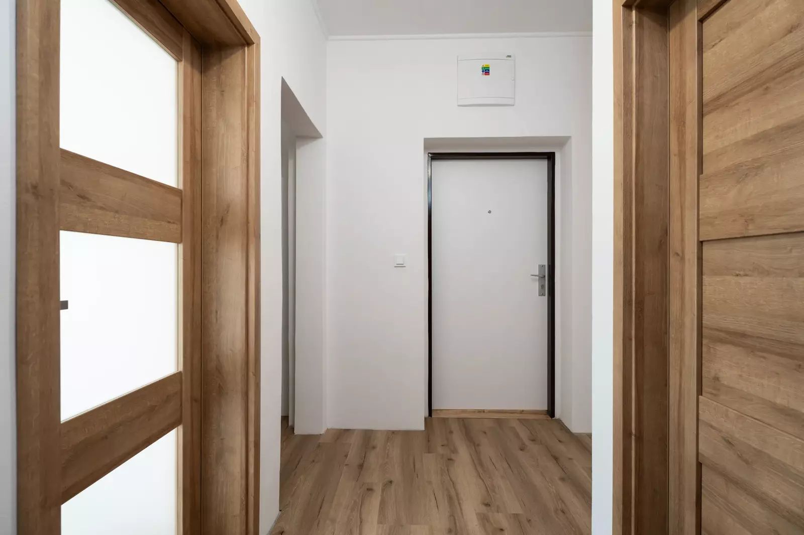 Koupelna disponuje sprchovým koutem a místem pro pračku, byt má kvalitní vinylové podlahy, sádrokartonové podhledy a bezpečnostní protipožární dveře.