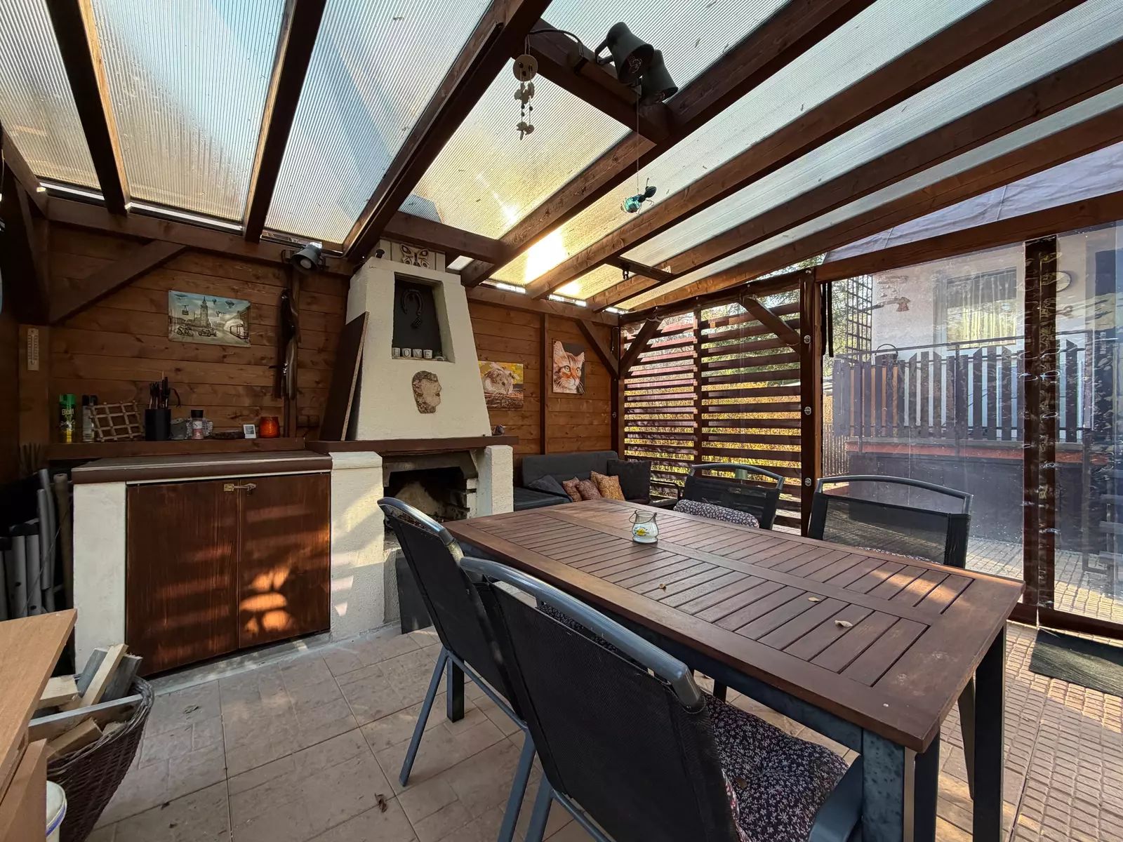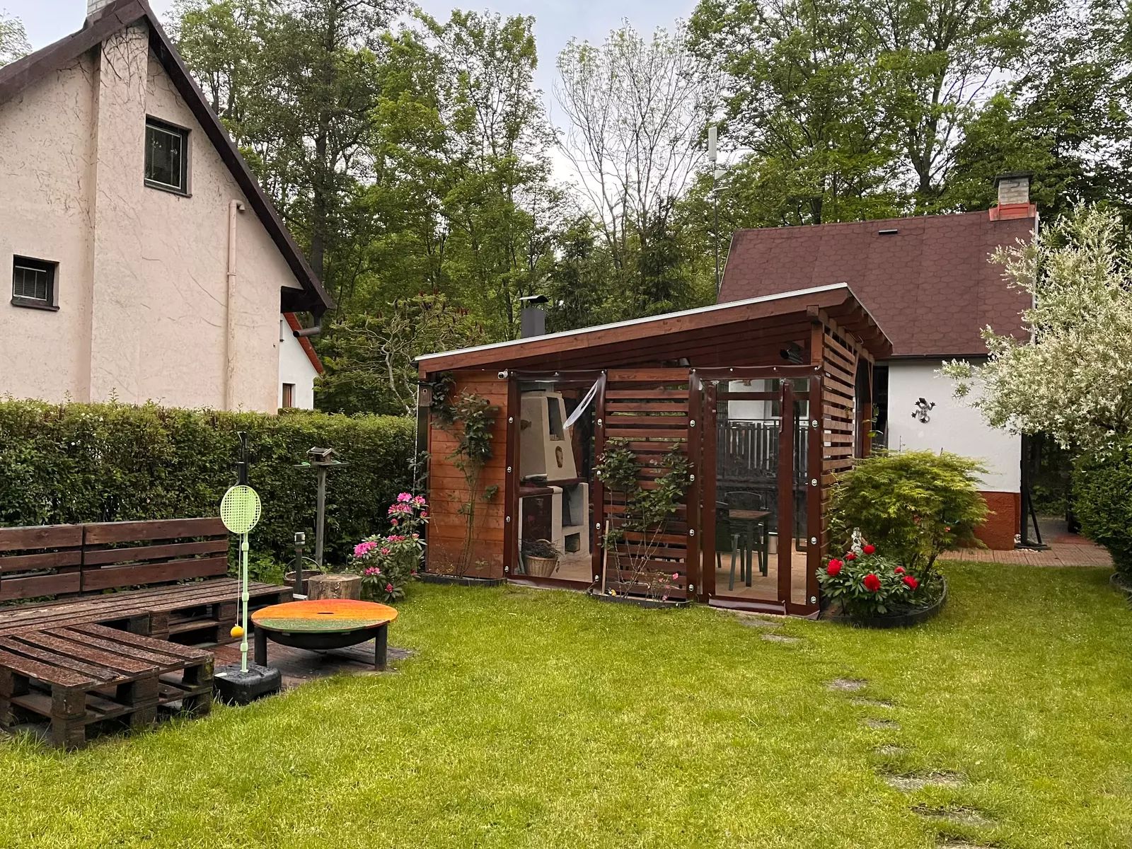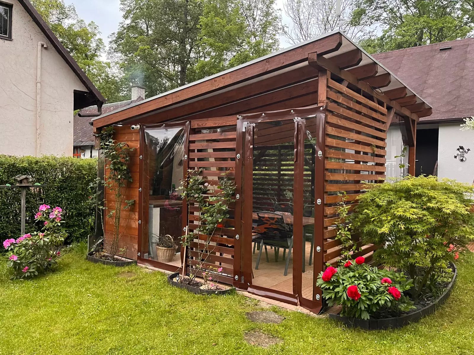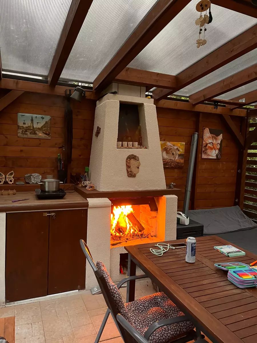 • Nově vybudovaná pergola (2023) o velikosti 4,5 × 5 m s kvalitním foliovým opláštěním na míru a venkovním krbem