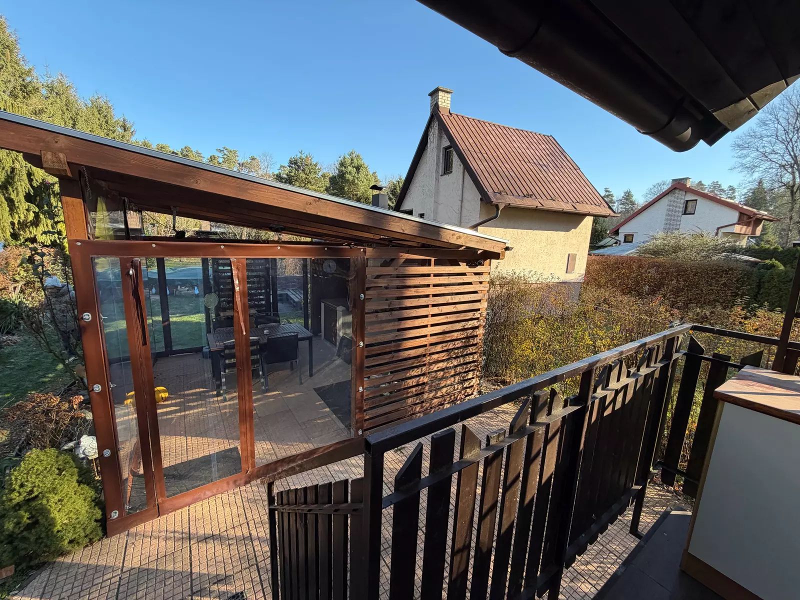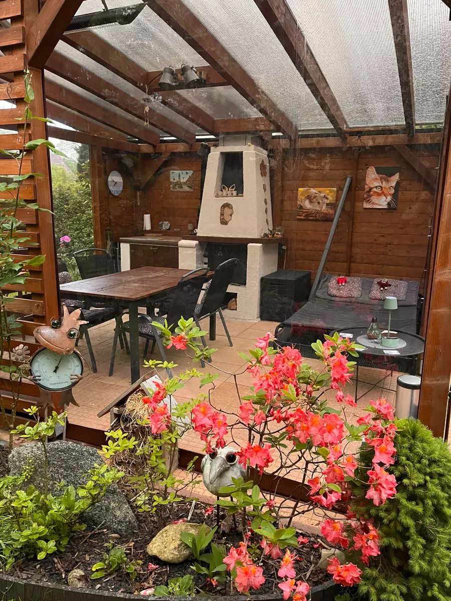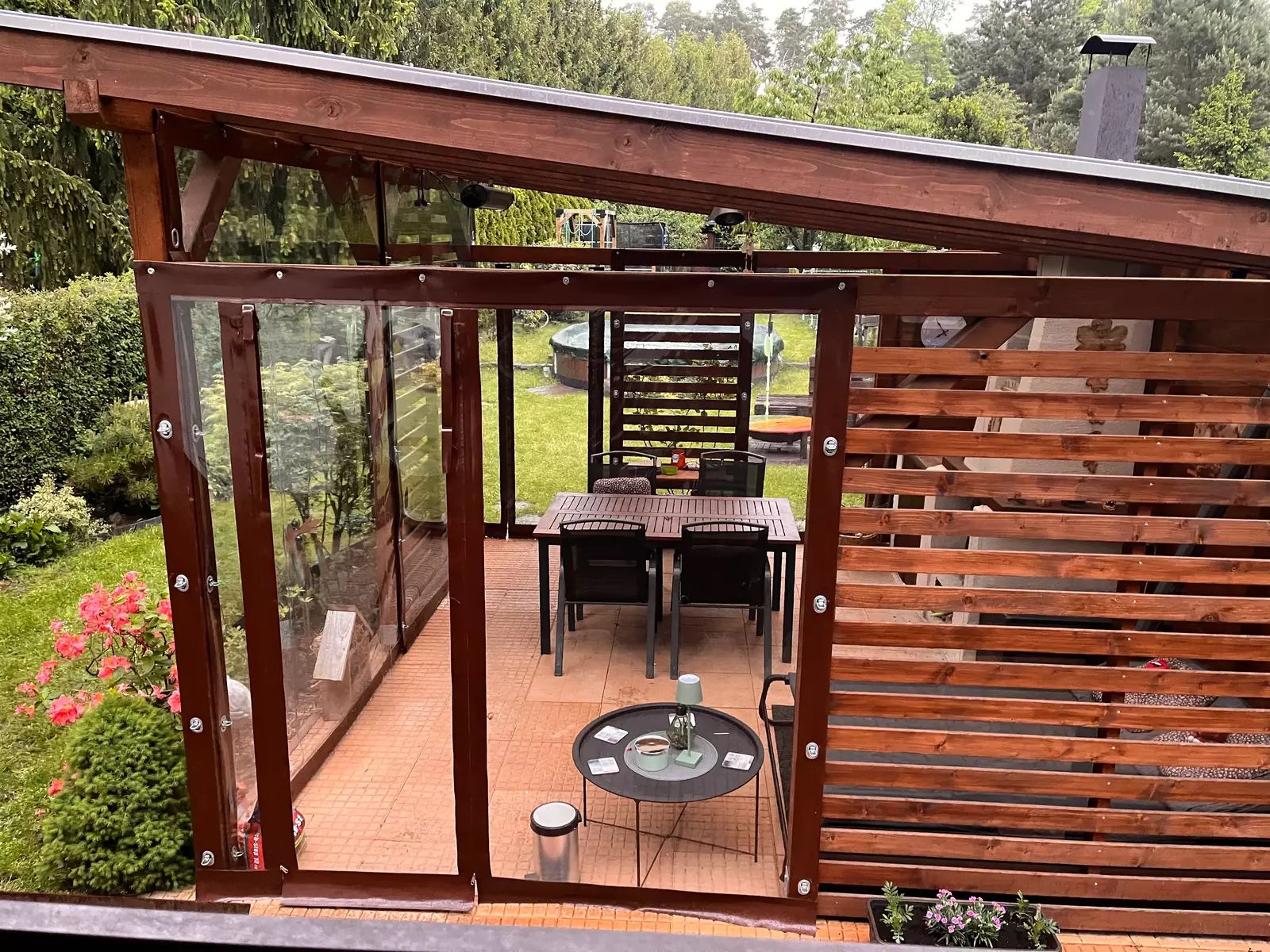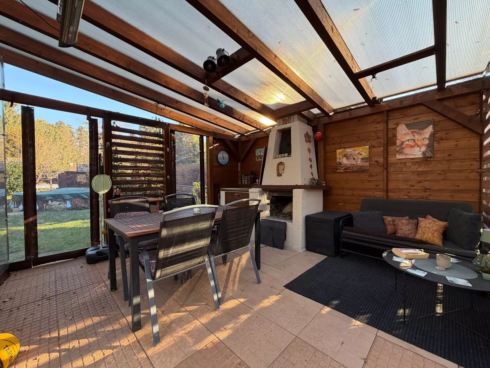 • Nově vybudovaná pergola (2023) o velikosti 4,5 × 5 m s kvalitním foliovým opláštěním na míru a venkovním krbem