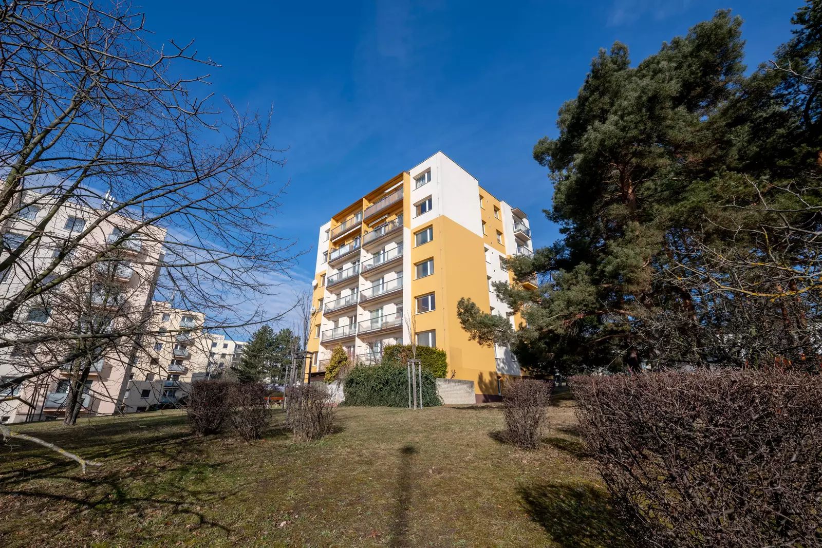 Byt se nachází na druhém patře dobře udržovaného panelového domu s výtahem, jenž je součástí šestipatrového objektu. Díky své poloze nabízí byt krásný výhled a je orientován na jihozápad, což zajistí mnoho světla během dne.