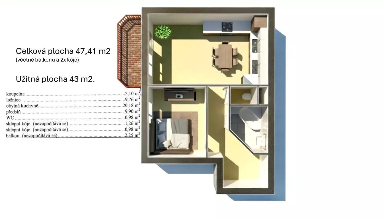Byt se skládá z předsíně, ložnice, obytné místnosti s kuchyňským koutem se vstupem na balkon, koupelny a wc. K bytu dále patří dvě sklepní kóje. Detail místností je vyobrazen na fotografii. Nízké provozní poplatky (zateplený panelový dům), fond oprav je vybírán v částce 25 Kč/m2.