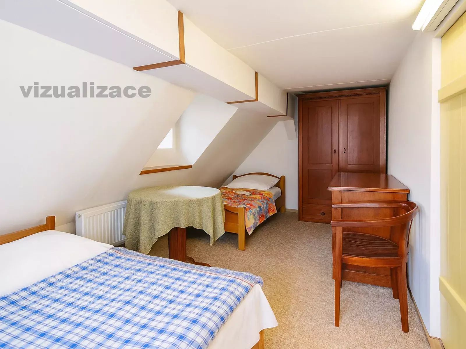 Z tohoto pokoje se poté vstupuje do dvou malých podkrovních ložnic, vhodných ke spaní nebo jako úložné prostory v nízké šikmině střechy.