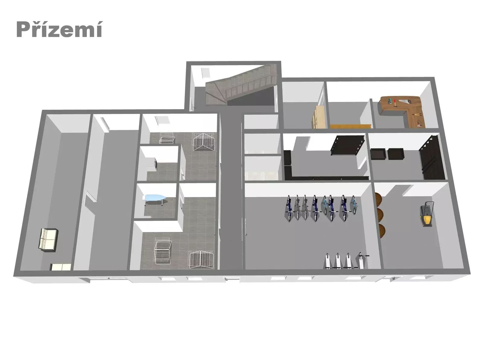 1:NP: Kombinace kanceláří a úložných prostor. Část je vyhrazena pro komerční využití (např. cukrárna/restaurace) s možností navazujícího venkovního posezení