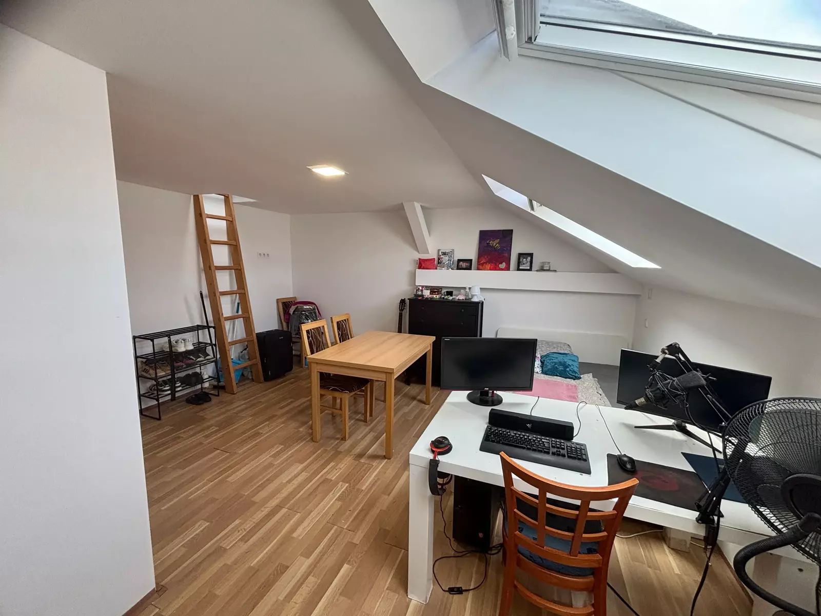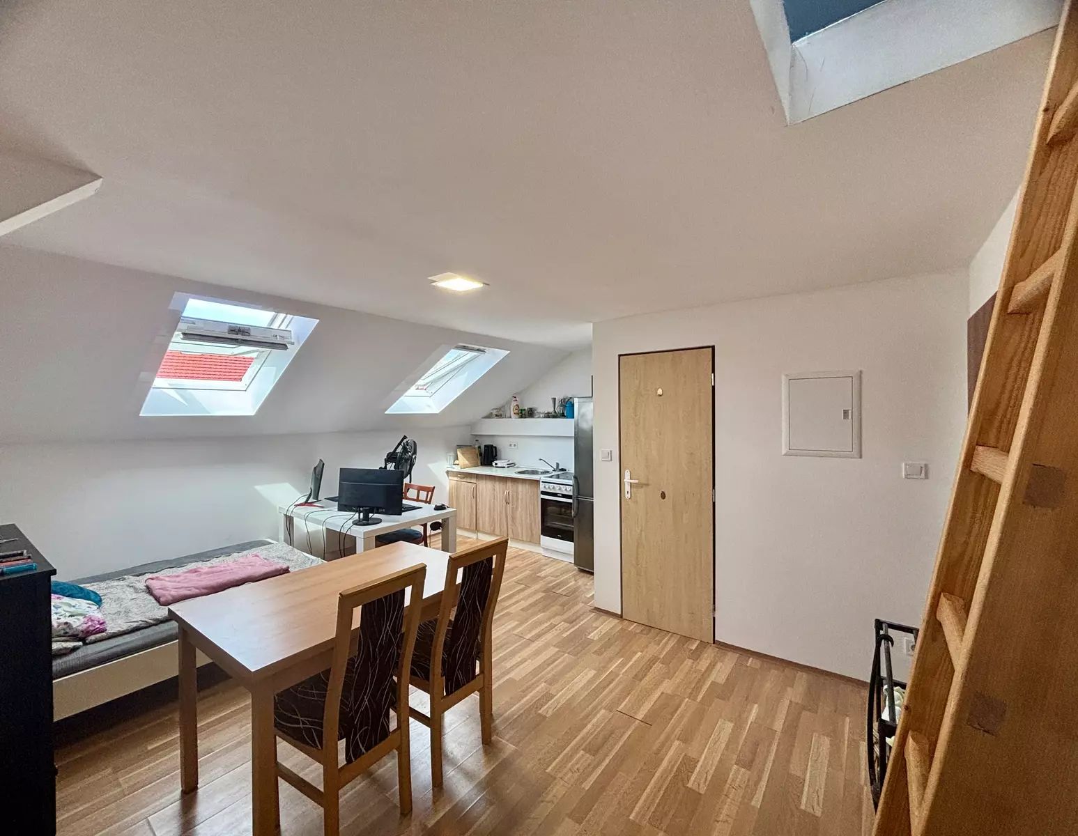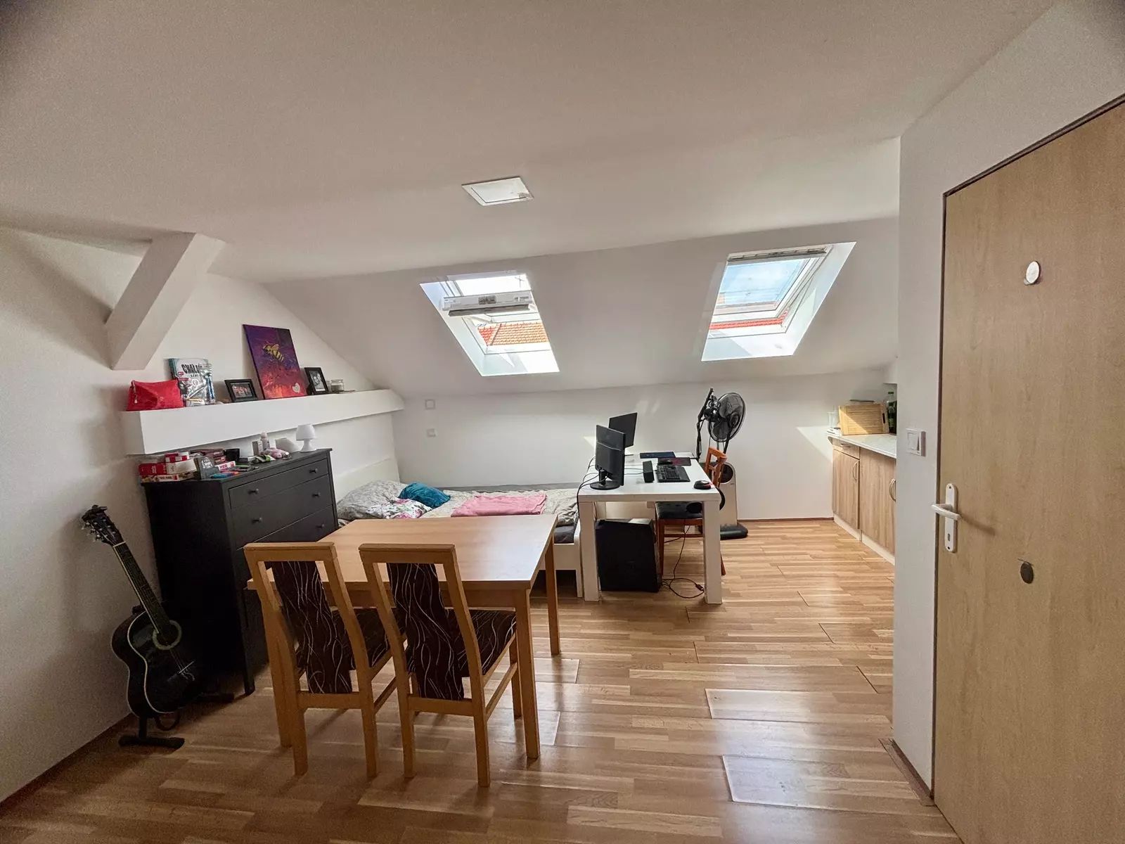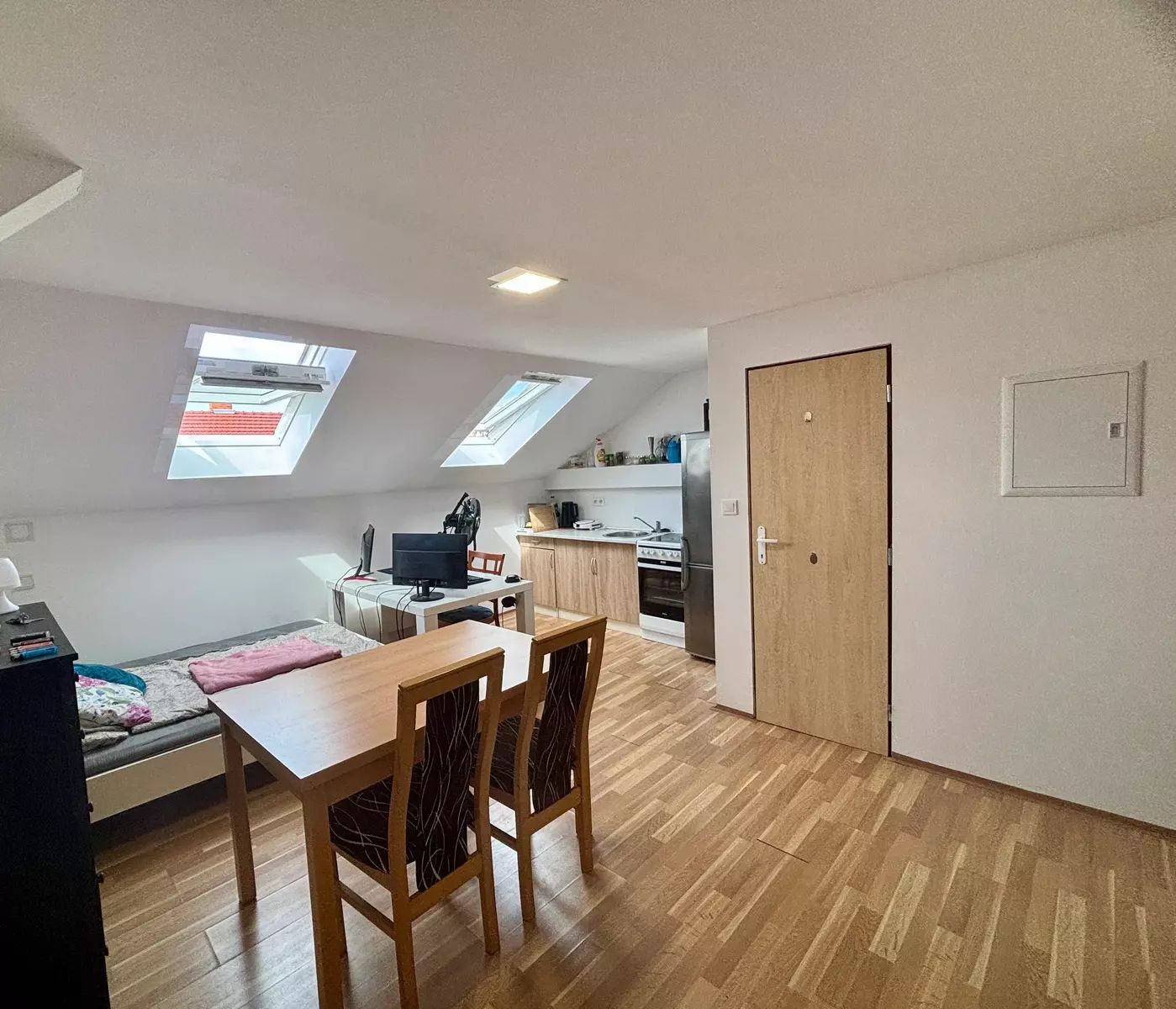 Nabízíme k pronájmu světlý podkrovní byt 1+kk o výměře cca 30 m², který se nachází v prvním patře rodinného domu přímo v centru města Břeclavi. Byt je situován v těsné blízkosti autobusového i vlakového nádraží, což zajišťuje výbornou dopravní dostupnost. Předností tohoto bytu je velký úložný prostor a to, že je částečně vybaven, součástí je jídelní stůl se židlemi a velká postel.