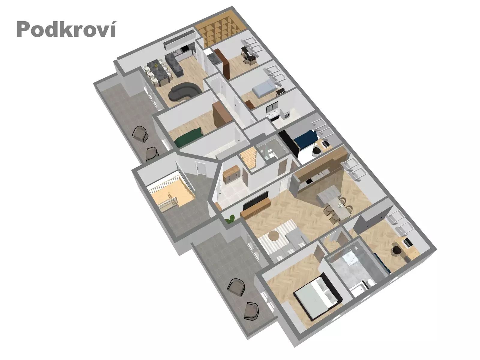 1:NP: Kombinace kanceláří a úložných prostor. Část je vyhrazena pro komerční využití (např. cukrárna/restaurace) s možností navazujícího venkovního posezení