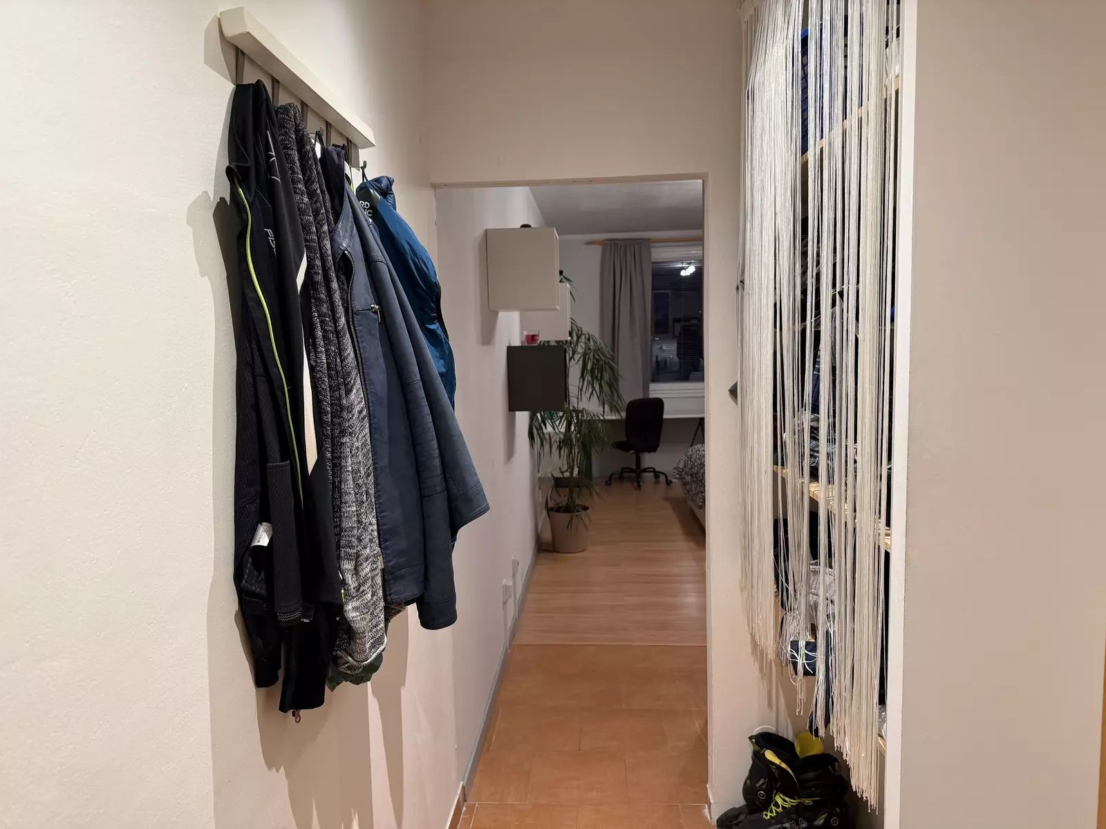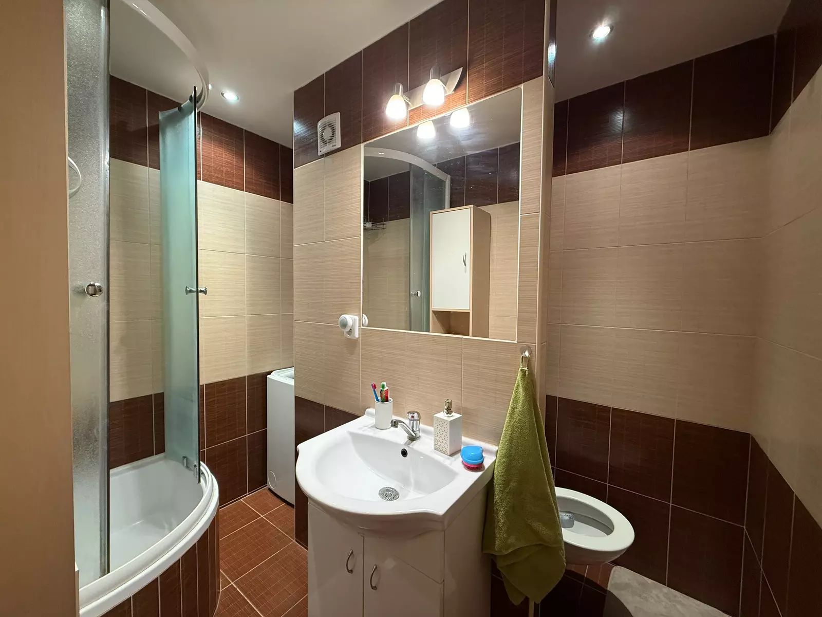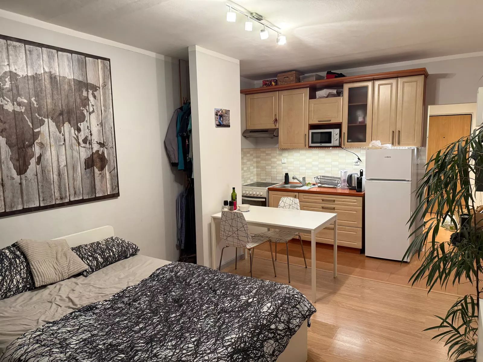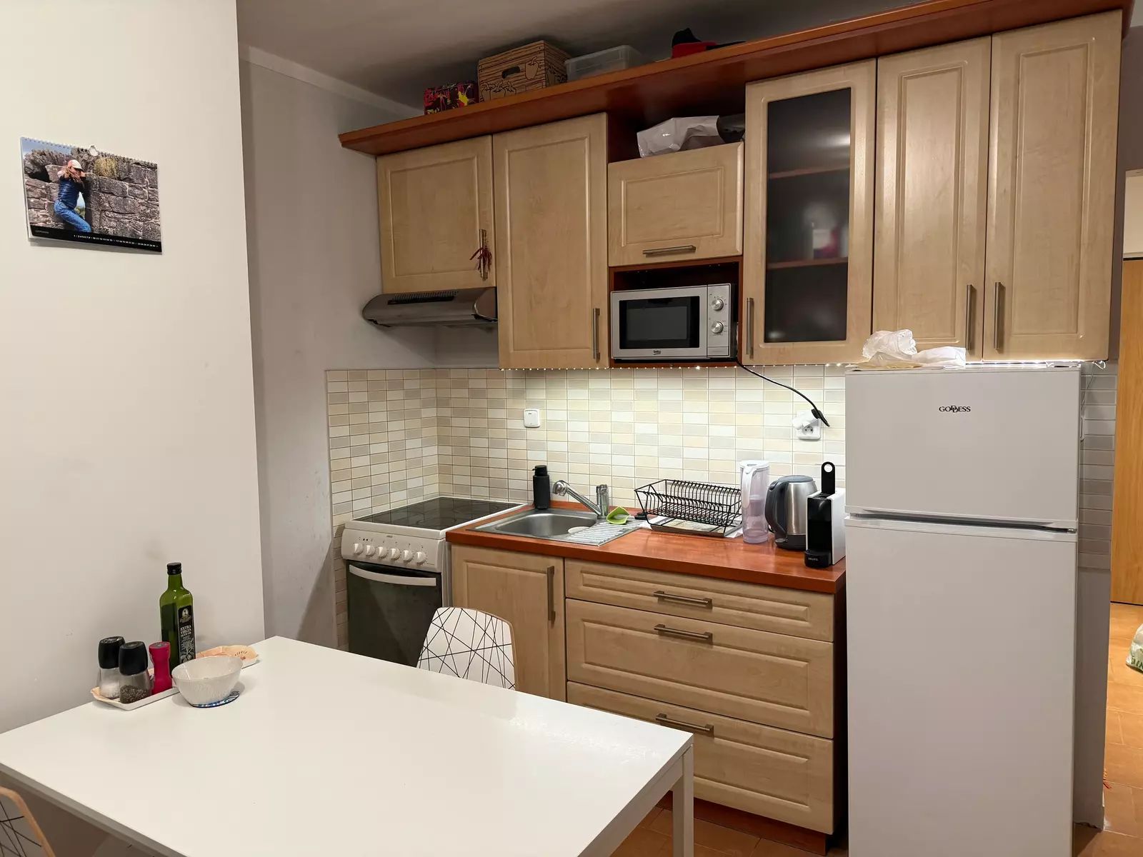 Vstupní chodba, koupelna s toaletou a pračka, pokoj s kuchyňským koutem, který je vybavený veškerými spotřebiči.
