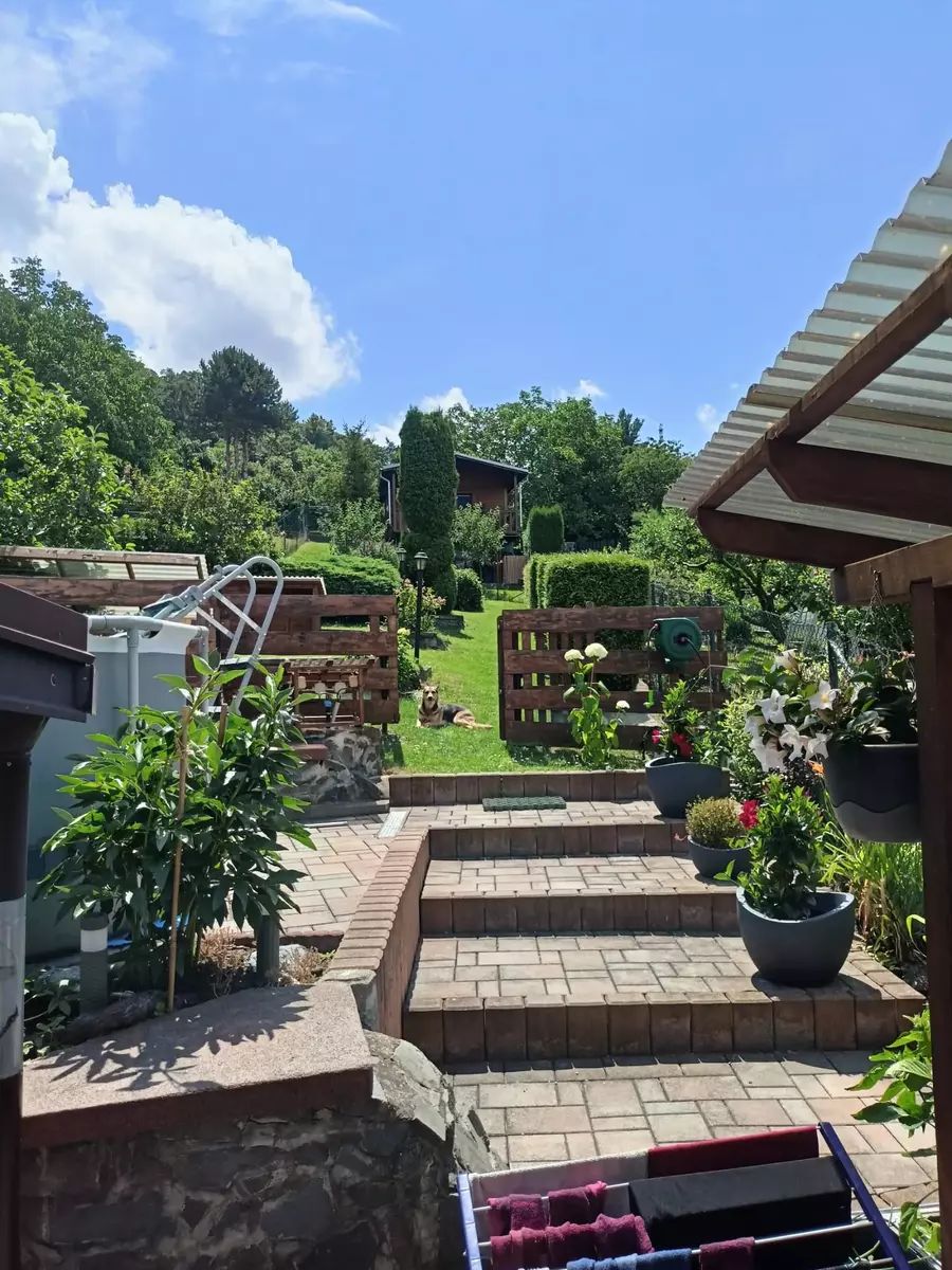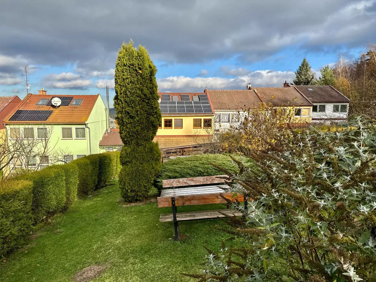 Zahrada je pečlivě udržovaná a lne se směrem nahoru, což vytváří příjemné soukromí a jedinečnou atmosféru. Na konci zahrady se nachází zahradní domek – bonus pro příležitostné přespání dětí či hostů. Praktický je i vstup do zahrady z druhé strany pozemku. A když vyjdete touto brankou, dojdete po 470 metrech na rozhlednu Cvilín.