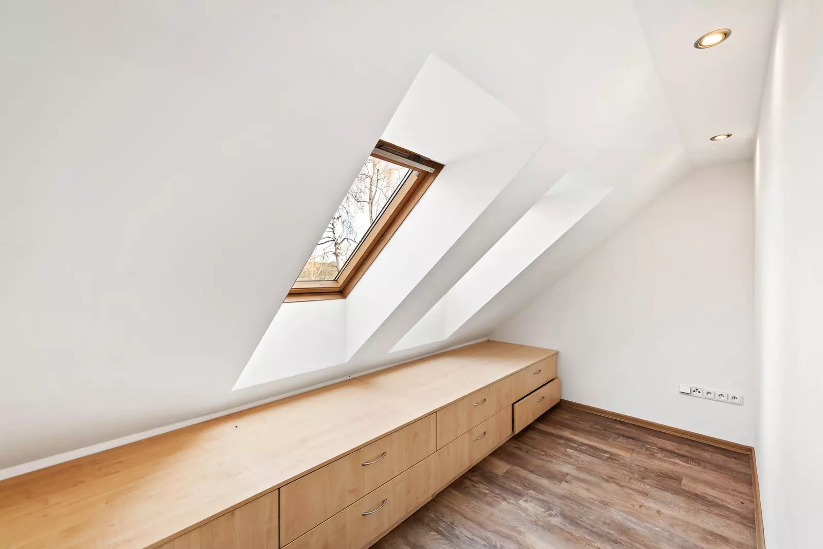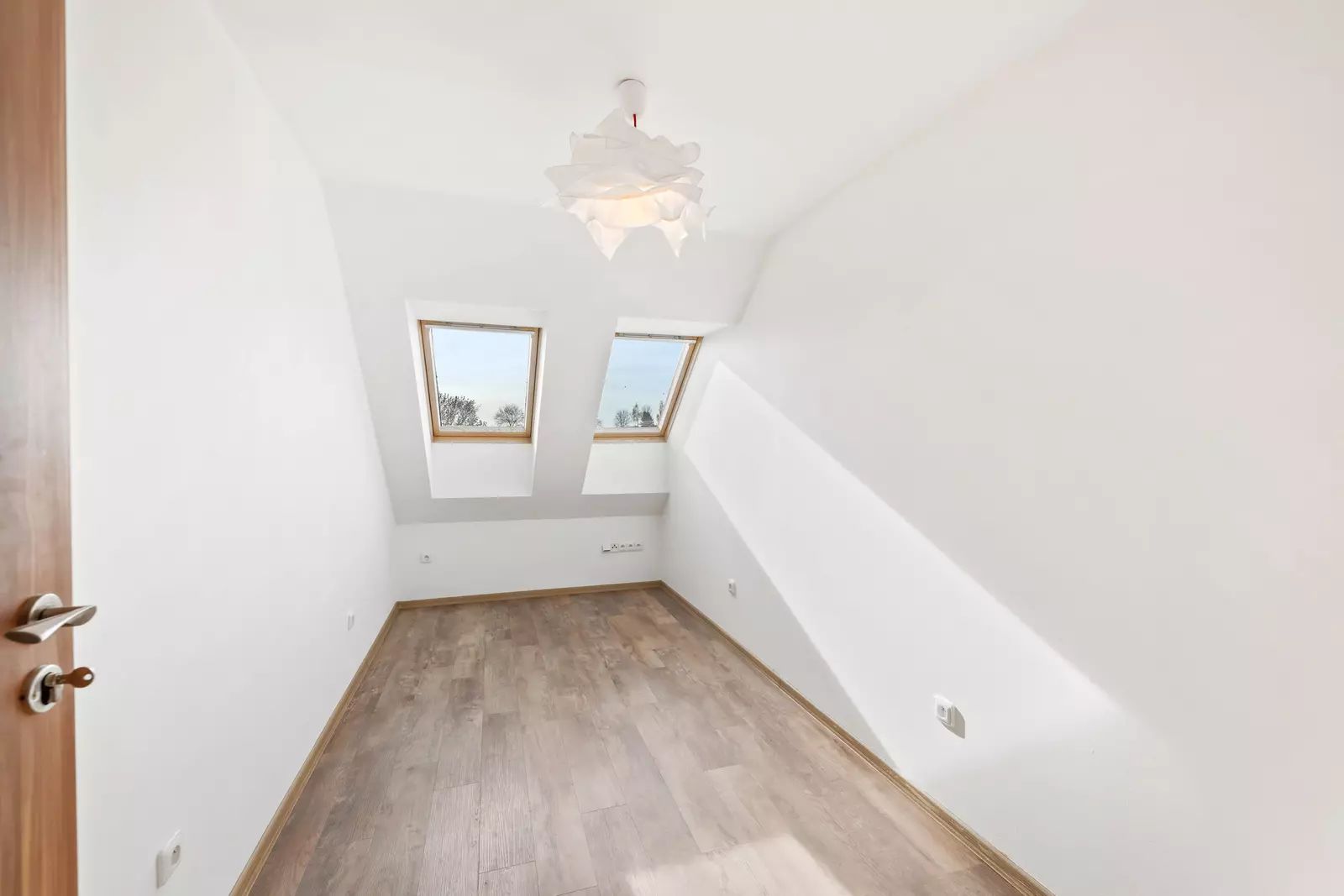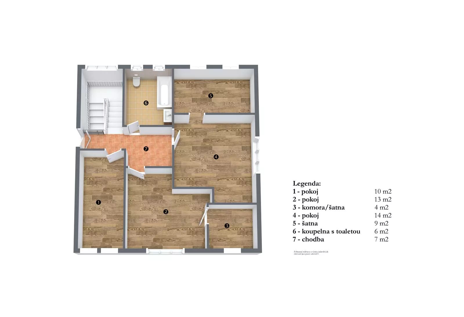 Podkroví: schodiště, chodba, 2 pokoje se šatnami, pokoj, koupelna s WC.