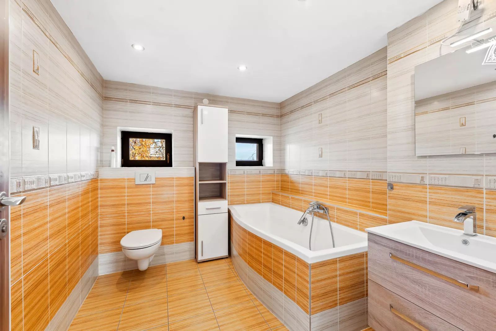 V celém domě jsou dřevěná eurookna s dvojskly, podlahy vinylové a dlažba. Dále podlahové vytápění a v ložnici a chodbách je navíc i radiátor. Dům je zateplen 12 cm polystyrenem.