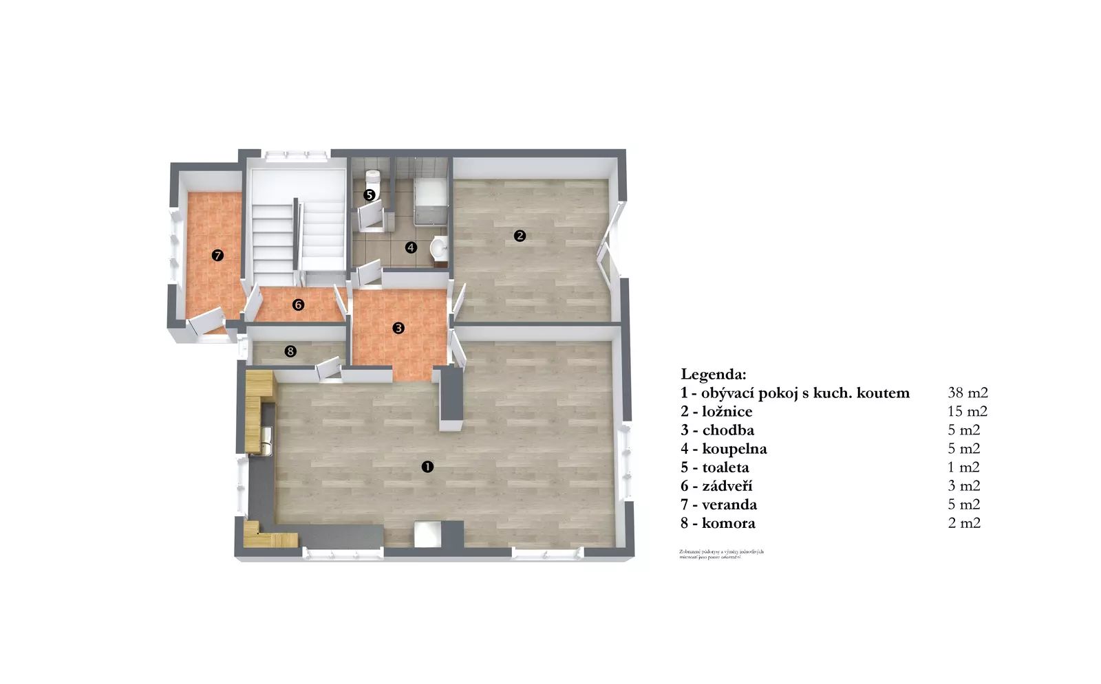 Přízemí: vstupní veranda, zádveří, chodba, obývací pokoj s kuchyní, špajz, ložnice, koupelna a samostatné WC. Dále přechodně zadělané schodiště do suterénu.