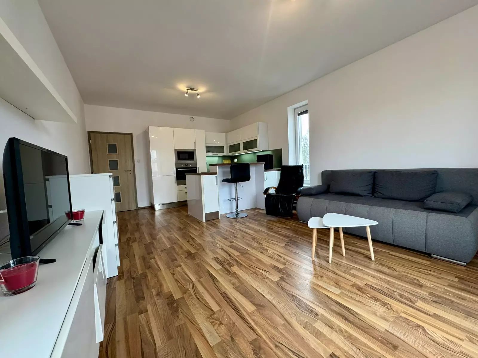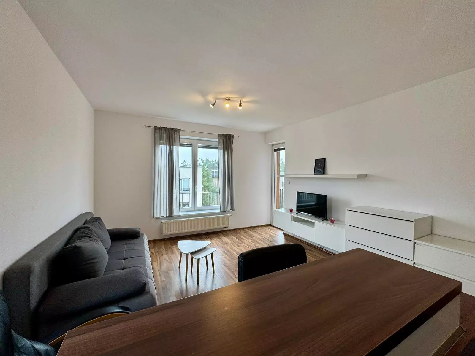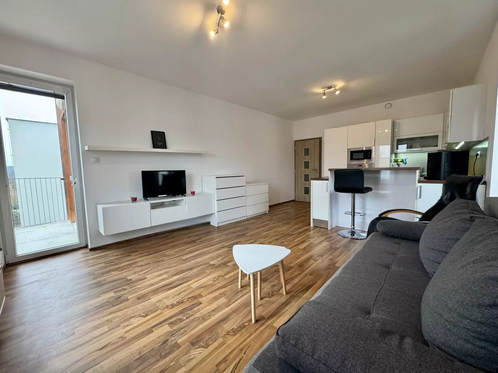 Byt je kompletně vybaven nábytkem i spotřebiči, a umožňuje tak okamžité nastěhování bez nutnosti dalších úprav. Dispozice zahrnuje prostorný obývací pokoj s kuchyňským koutem, samostatnou ložnici, menší koupelnu s WC a praktickou vstupní chodbu s úložnými prostory. Z obou pokojů je možný vstup na balkón o výměře 4m². Na patře k bytu náleží zděná sklepní kóje 1,4m².