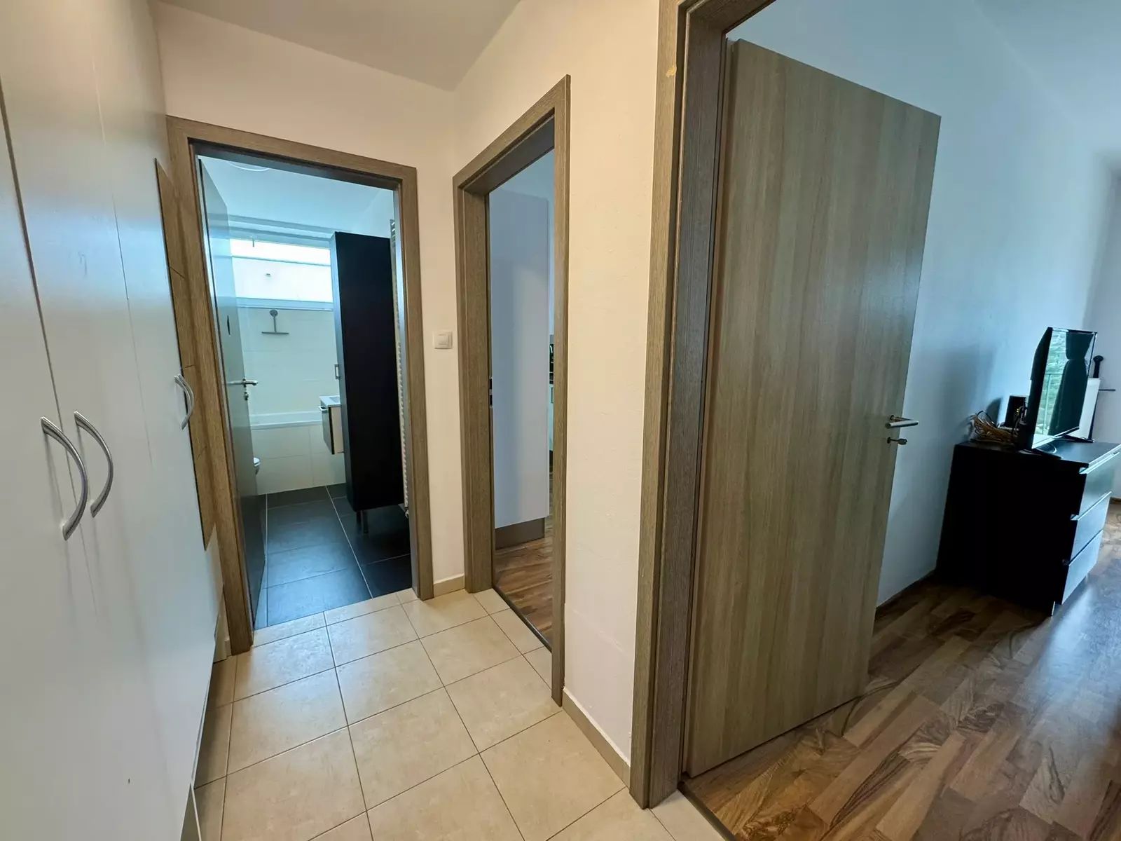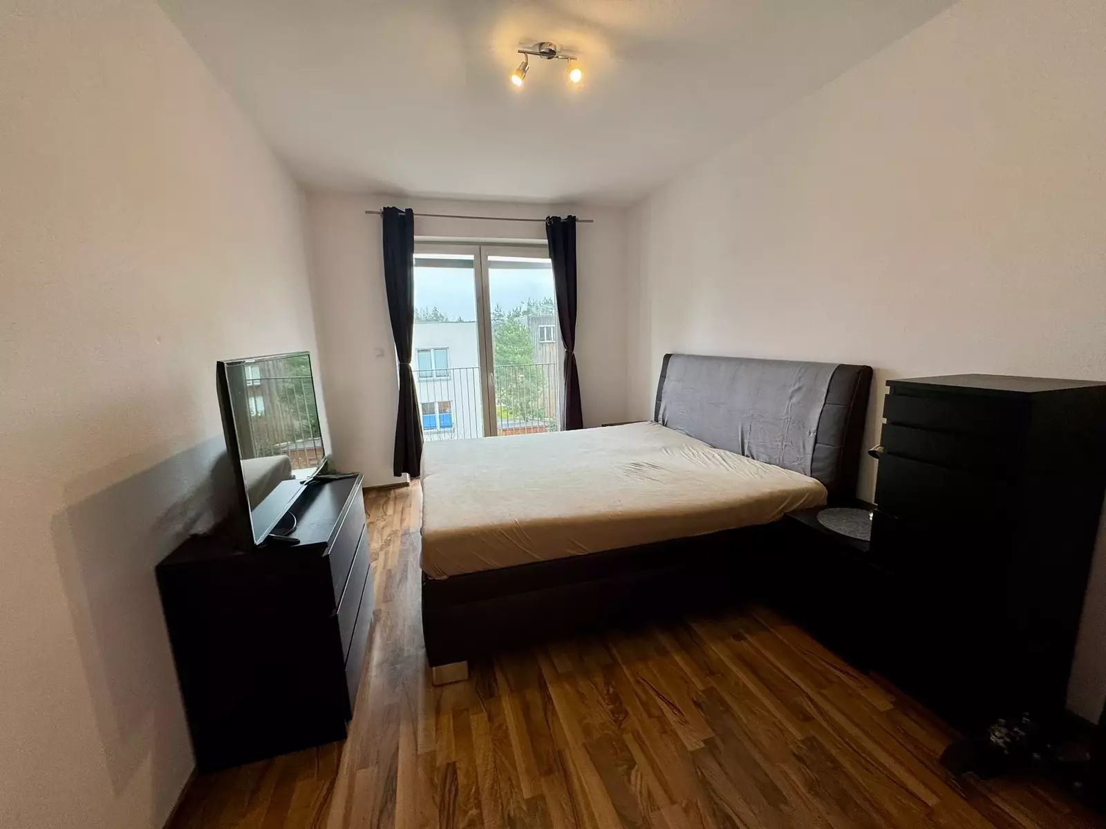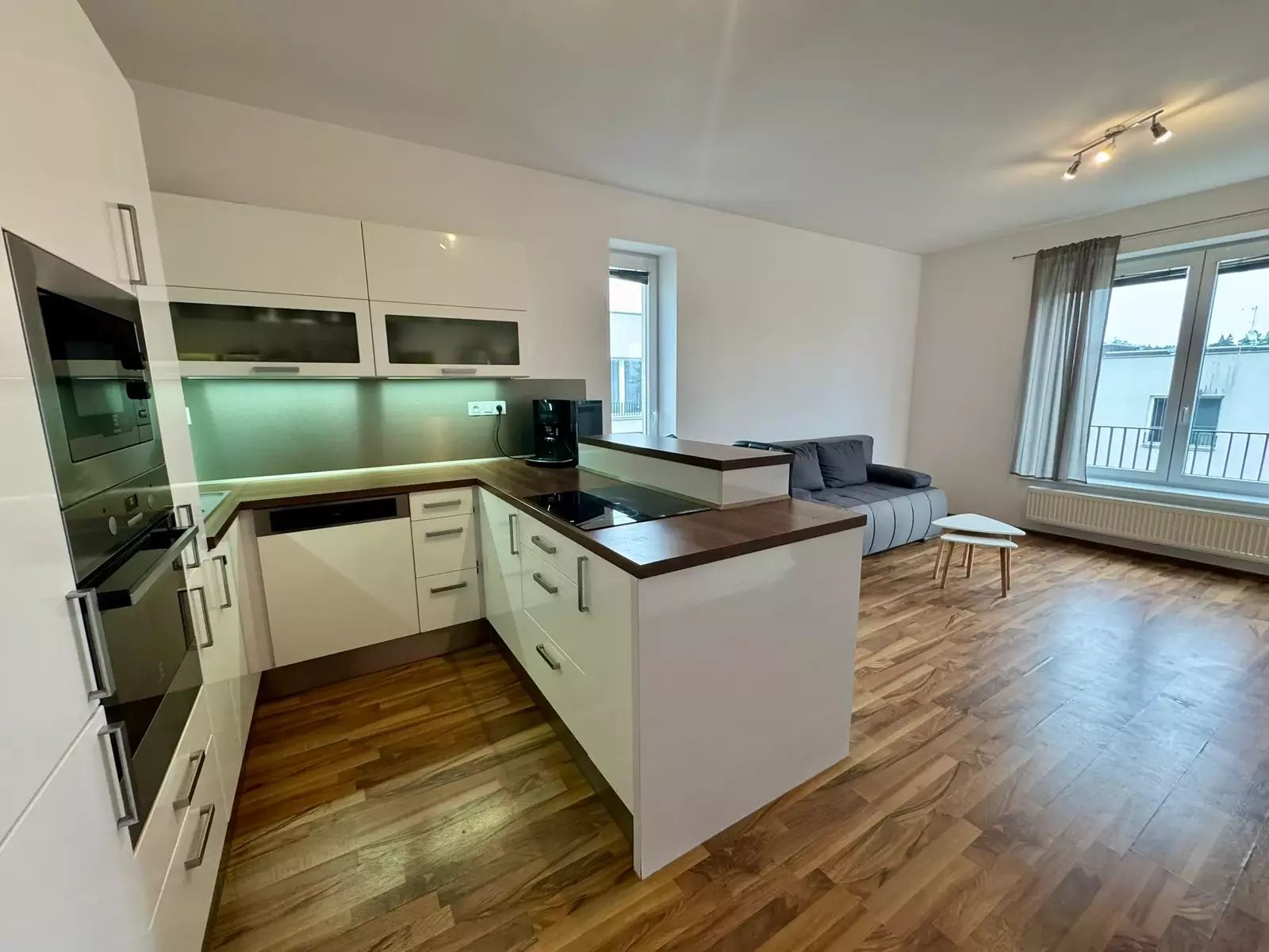 Byt je kompletně vybaven nábytkem i spotřebiči, a umožňuje tak okamžité nastěhování bez nutnosti dalších úprav. Dispozice zahrnuje prostorný obývací pokoj s kuchyňským koutem, samostatnou ložnici, menší koupelnu s WC a praktickou vstupní chodbu s úložnými prostory. Z obou pokojů je možný vstup na balkón o výměře 4m². Na patře k bytu náleží zděná sklepní kóje 1,4m².
