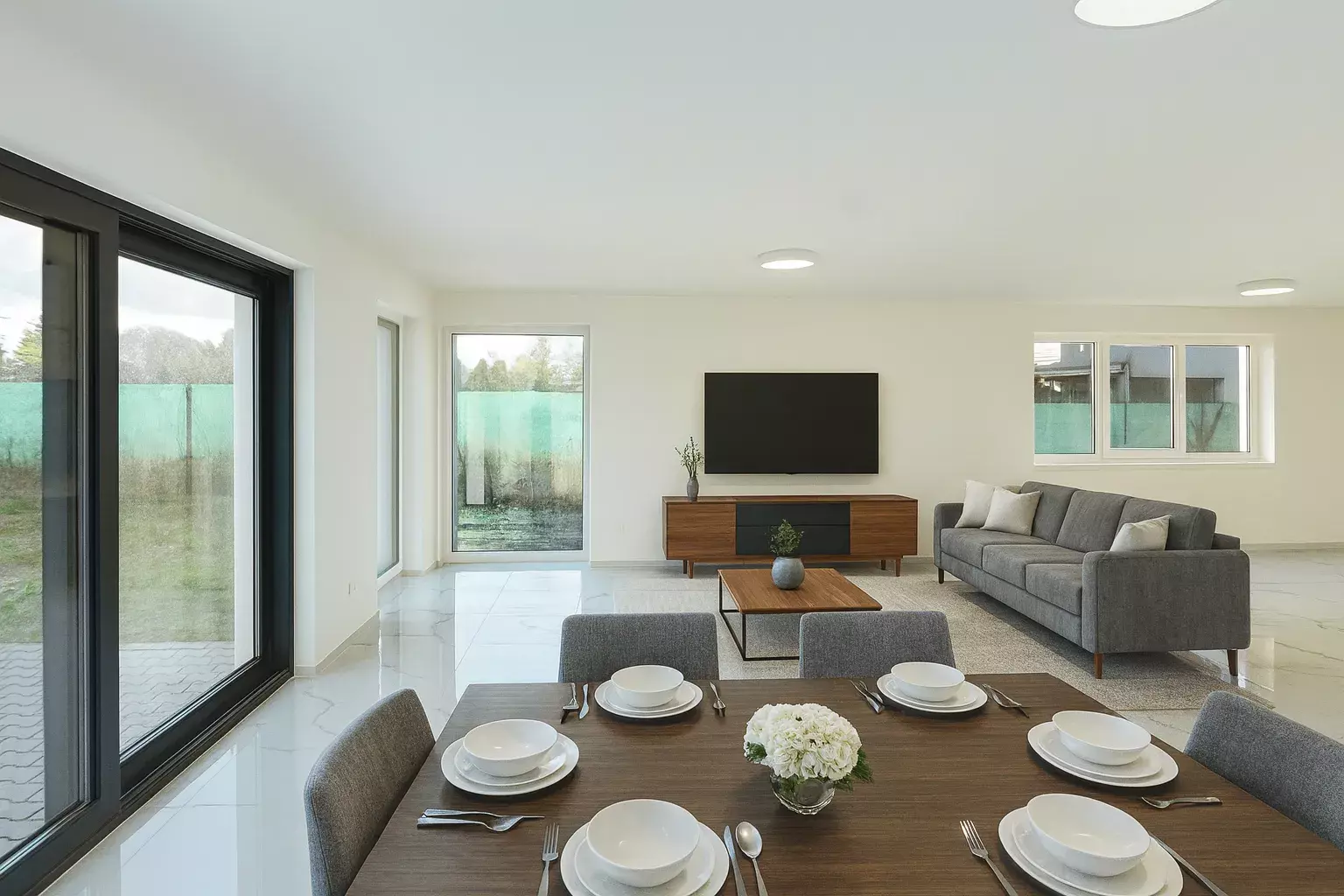 • prostorný obývací pokoj s velkým prostorem pro jídelní a obývací část, s přípravou na kuchyň a vstupem na zahradu