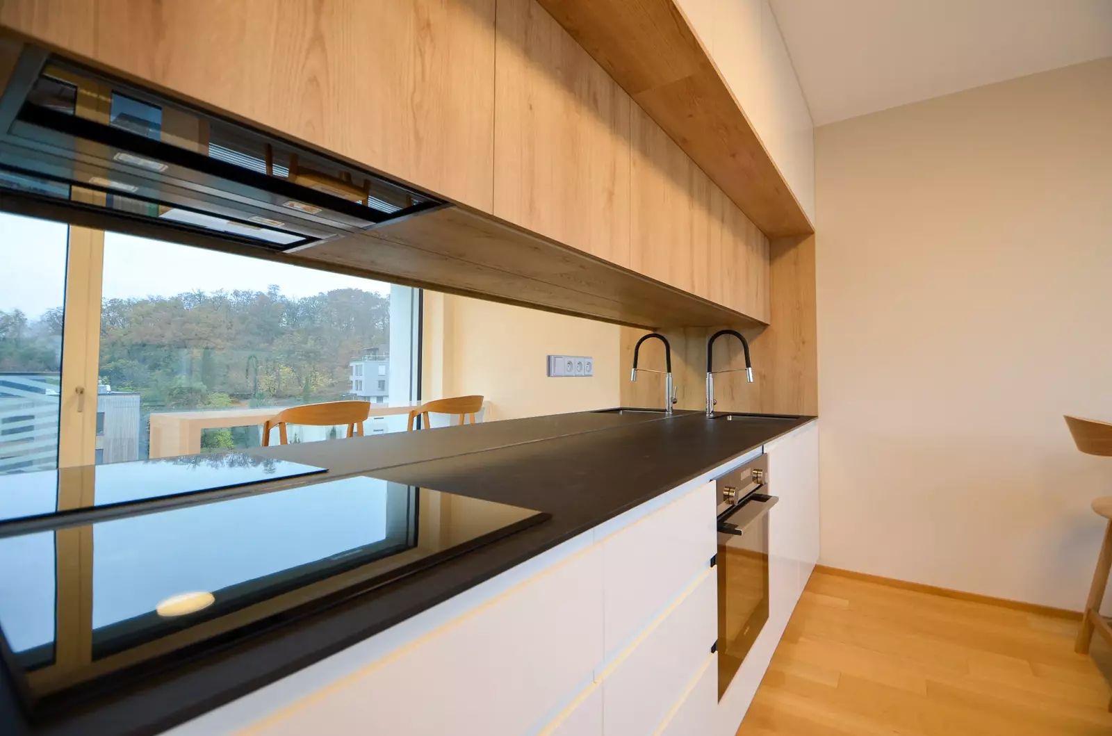 Kuchyňská linka je plně vybavena moderními spotřebiči Siemens, včetně lednice, mrazáku, indukční desky, trouby a myčky nádobí, což umožňuje pohodlné vaření a přípravu jídel.