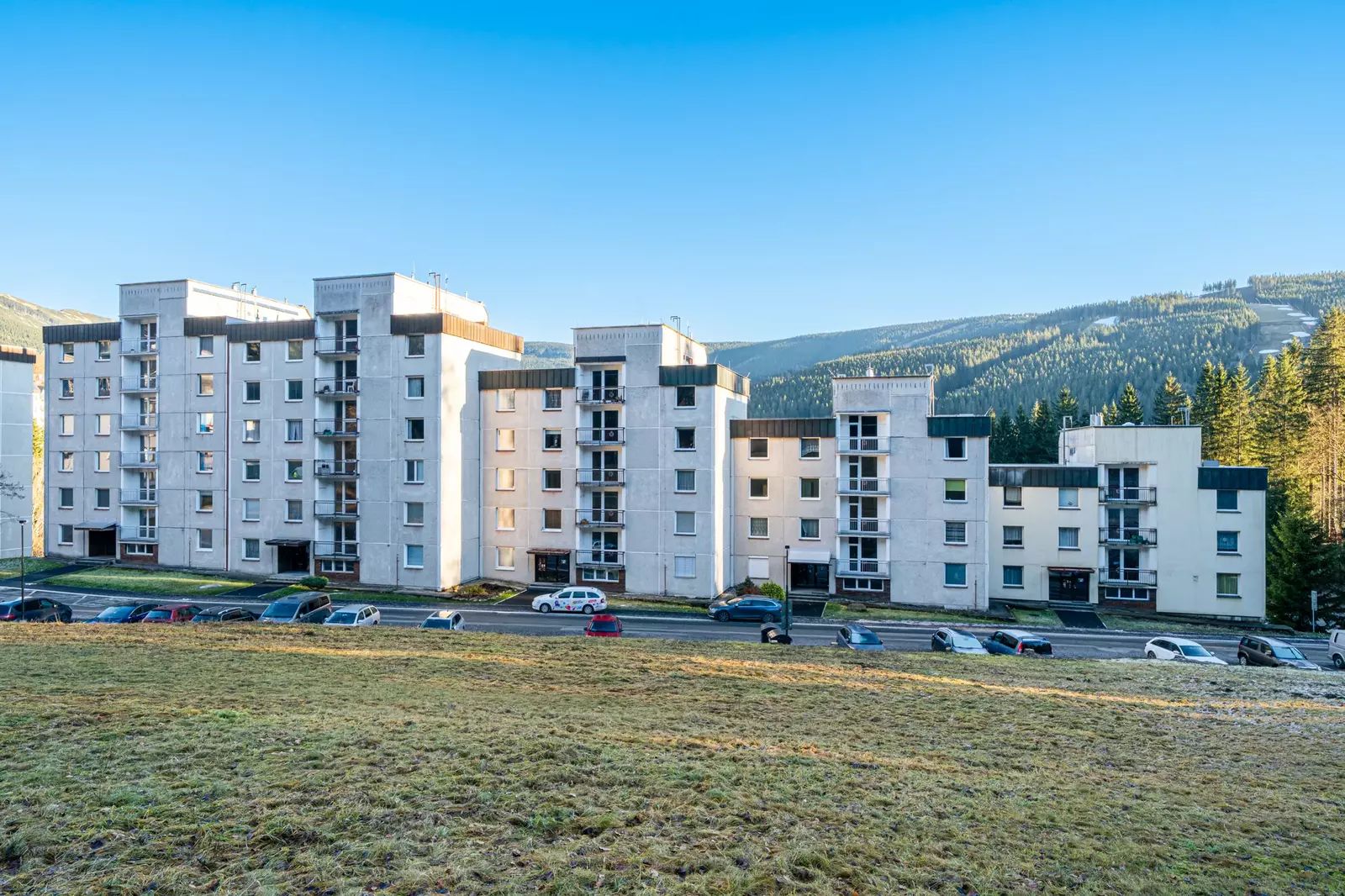 Dům je postaven ve svahu a byt je umístěn ve sníženém přízemí pětipodlažního domu s výtahem, což zajišťuje pohodlný přístup. Součástí bytu je zasklená lodžie o velikosti 3 m², která nabízí příjemné místo k relaxaci s krásným výhledem do okolní přírody a na horské panorama.