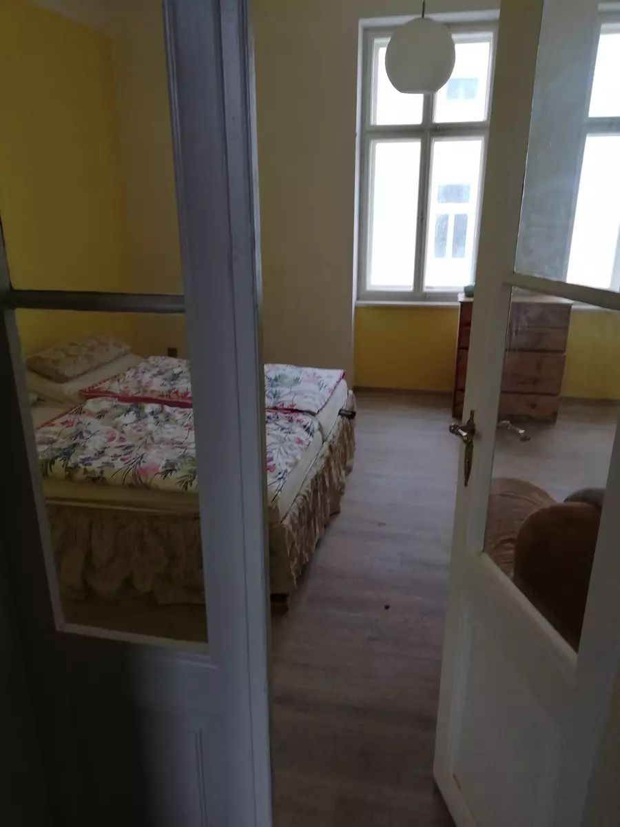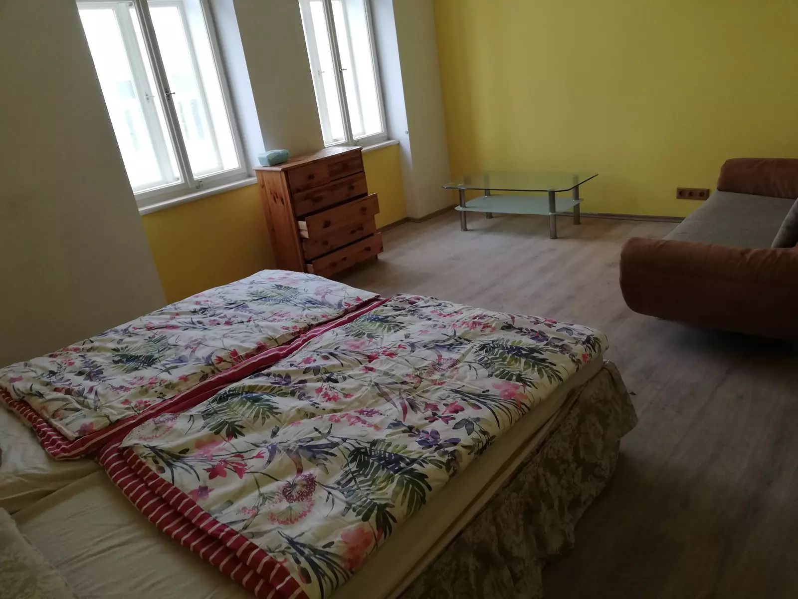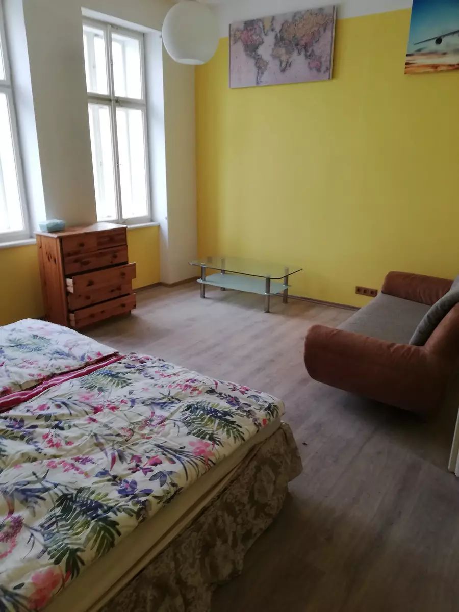 Do pokoje vedou dvoukřídlé prosklené secesní dveře, v pokoji jsou dvě okna do Husovy ulice, manželská postel možno s povlečením, sedačka, skříňka. Na podlahách je kvalitní vinylová podlaha. V každé místnosti je dostatek zásuvek, aby se nepoužívala žádná prodlužovačka.