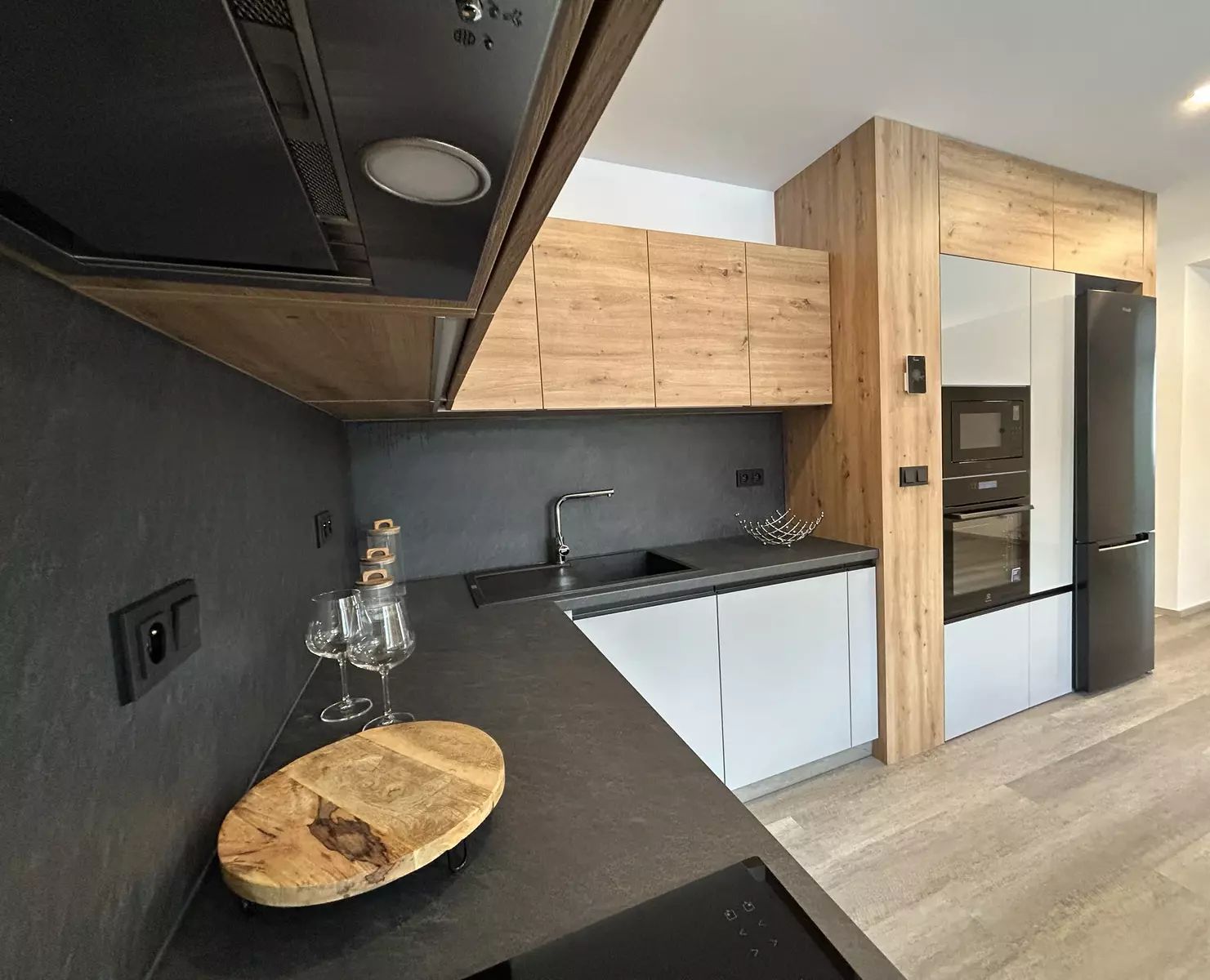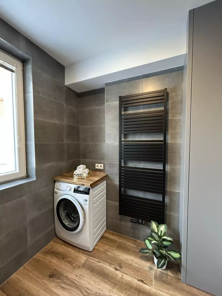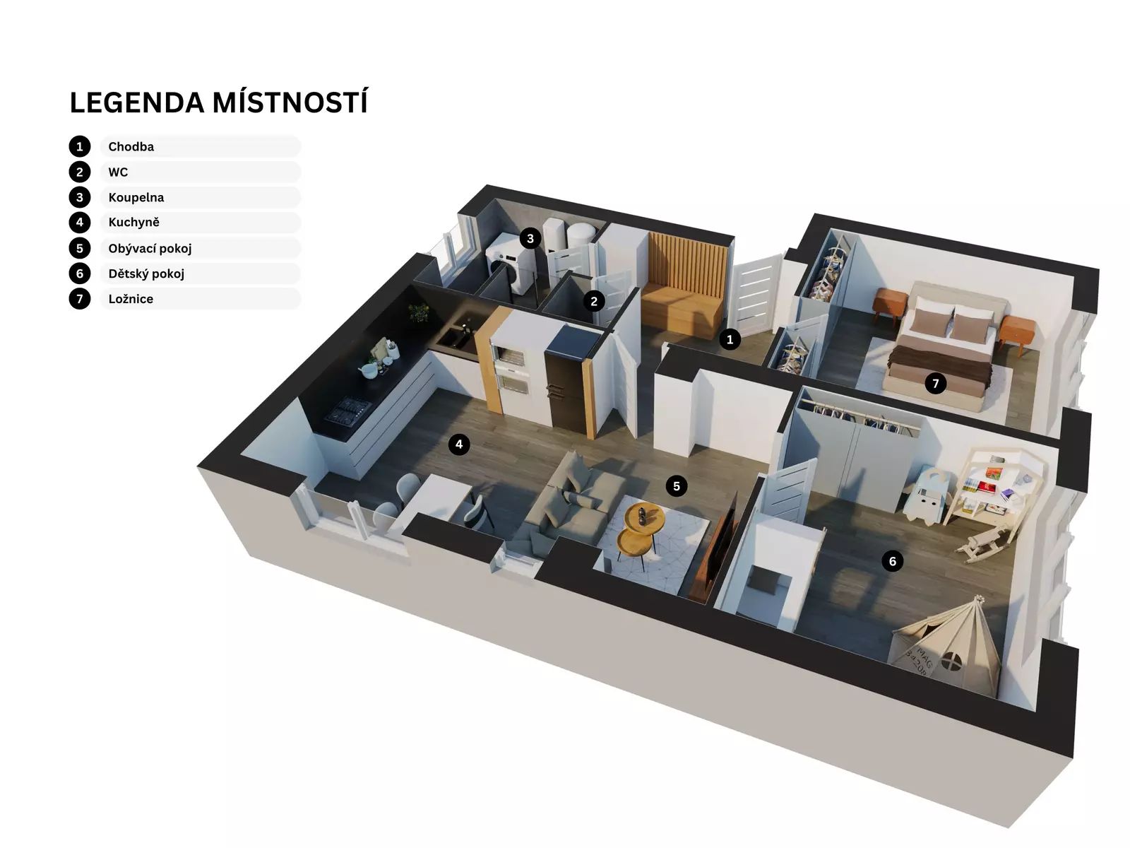 Sestává ze dvou obytných místností s velkými okny orientovanými do zahrady, z nichž jedna je již vybavená velkou šatní skříní na míru a manželskou postelí. Dále je zde velká místnost s kuchyňským koutem, jehož součástí je plně vybavená kuchyňská linka s vestavnými spotřebiči, jídelní stůl se židlemi a místo pro sedací soupravu a odpočinek. Mimo obývací místnosti je v bytě chodba zařízená nábytkem na míru, moderní koupelna s umývadlem, prostorným sprchovacím koutem a pračkou, a oddělená samostatná toaleta s vlastním umývadlem. Přístup do bytu je přes nové bezpečnostní dveře. Vytápění bytu zajišťuje podlahové topení, ohřev vody plynový kotel, ostatní spotřebiče jsou elektrické a je zde zavedený kabel pro TV a internet. K bytu náleží samostatně uzamykatelné sklepní prostory.