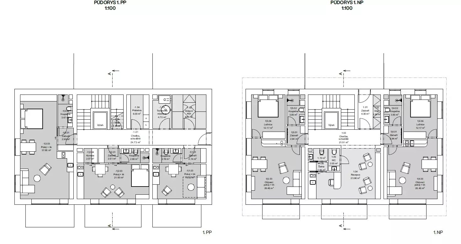 • Jednotky mají vlastní sociální zařízení a kuchyňku, některé přímo s přístupem na terasu nebo balkon