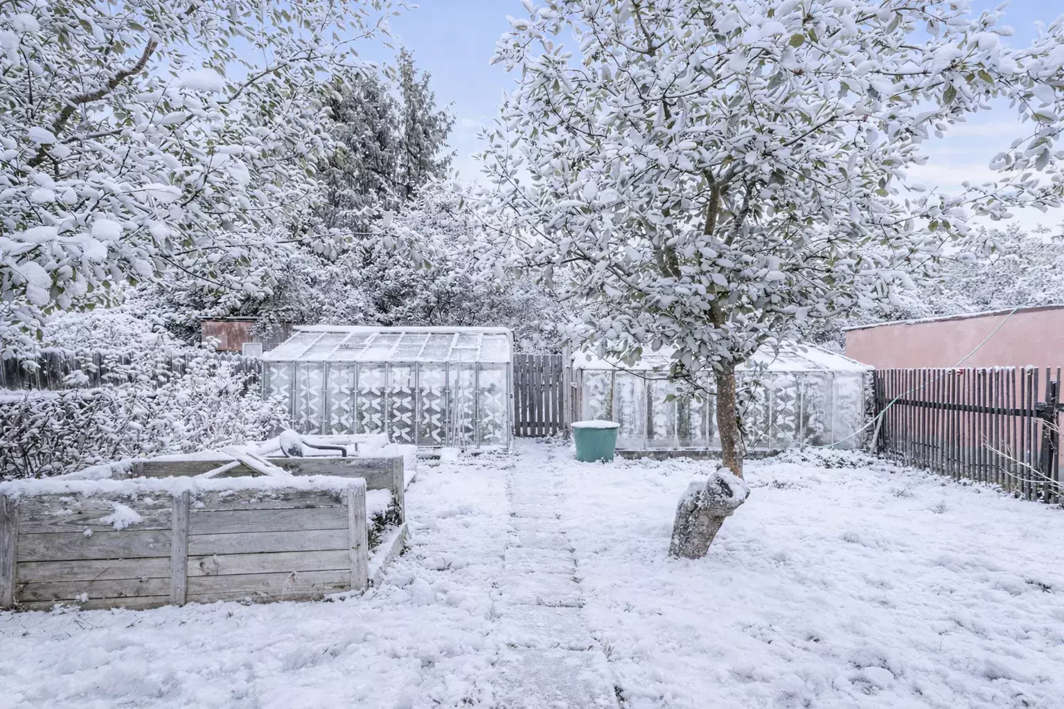 Pozemek má trojúhelníkový tvar, pravá část zahrady je okrasná s altánem, levá užitková s ovocnými stromy, zeleninovou částí a dvěma velkými skleníky doplněnými dalším zahradním zázemím.