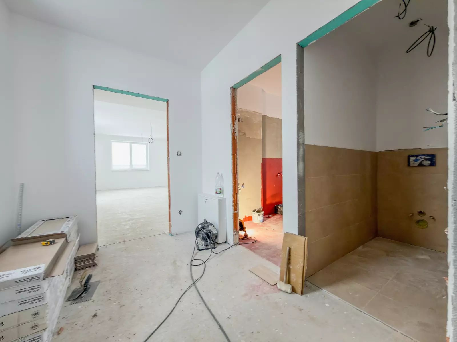 Dispozice: vstupní chodba, koupelna, WC, obývací pokoj s kuchyní, pokoj a ložnice.