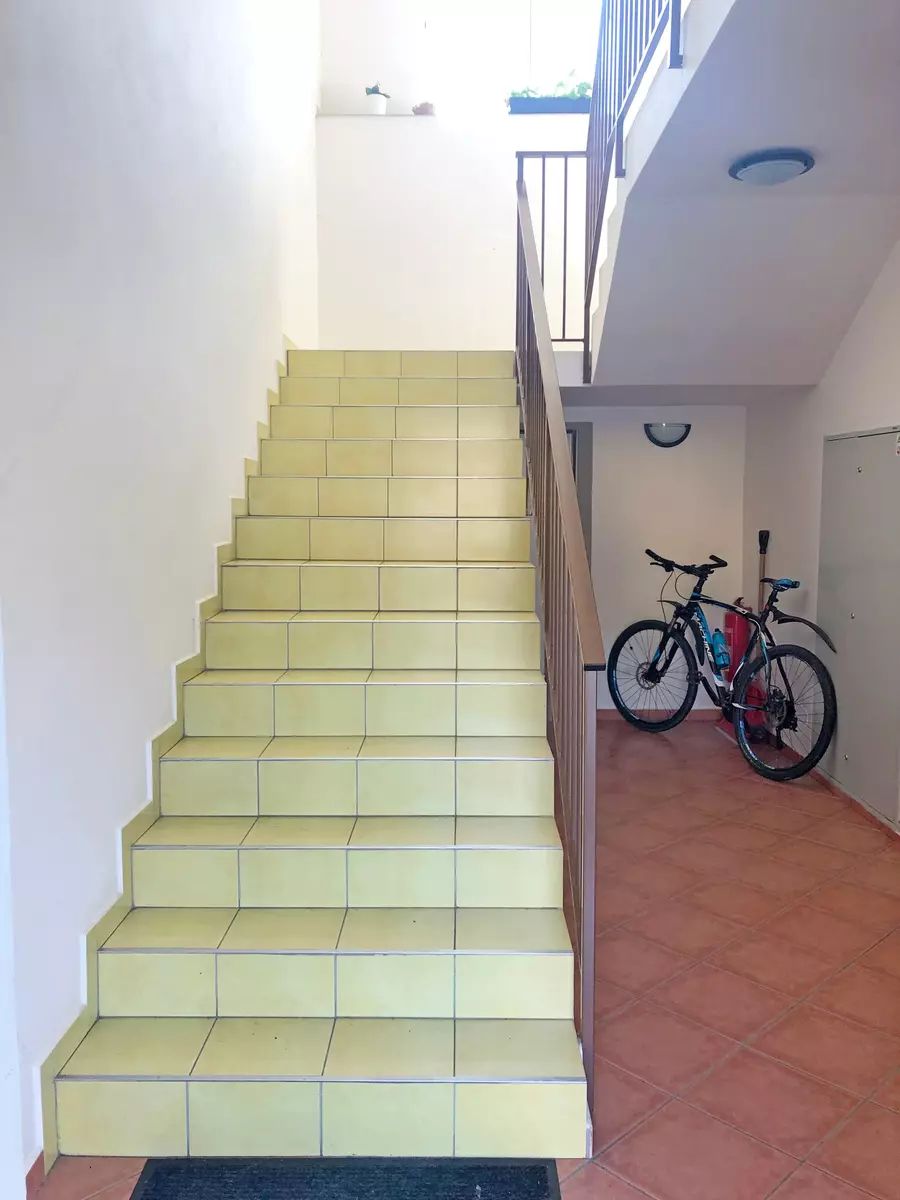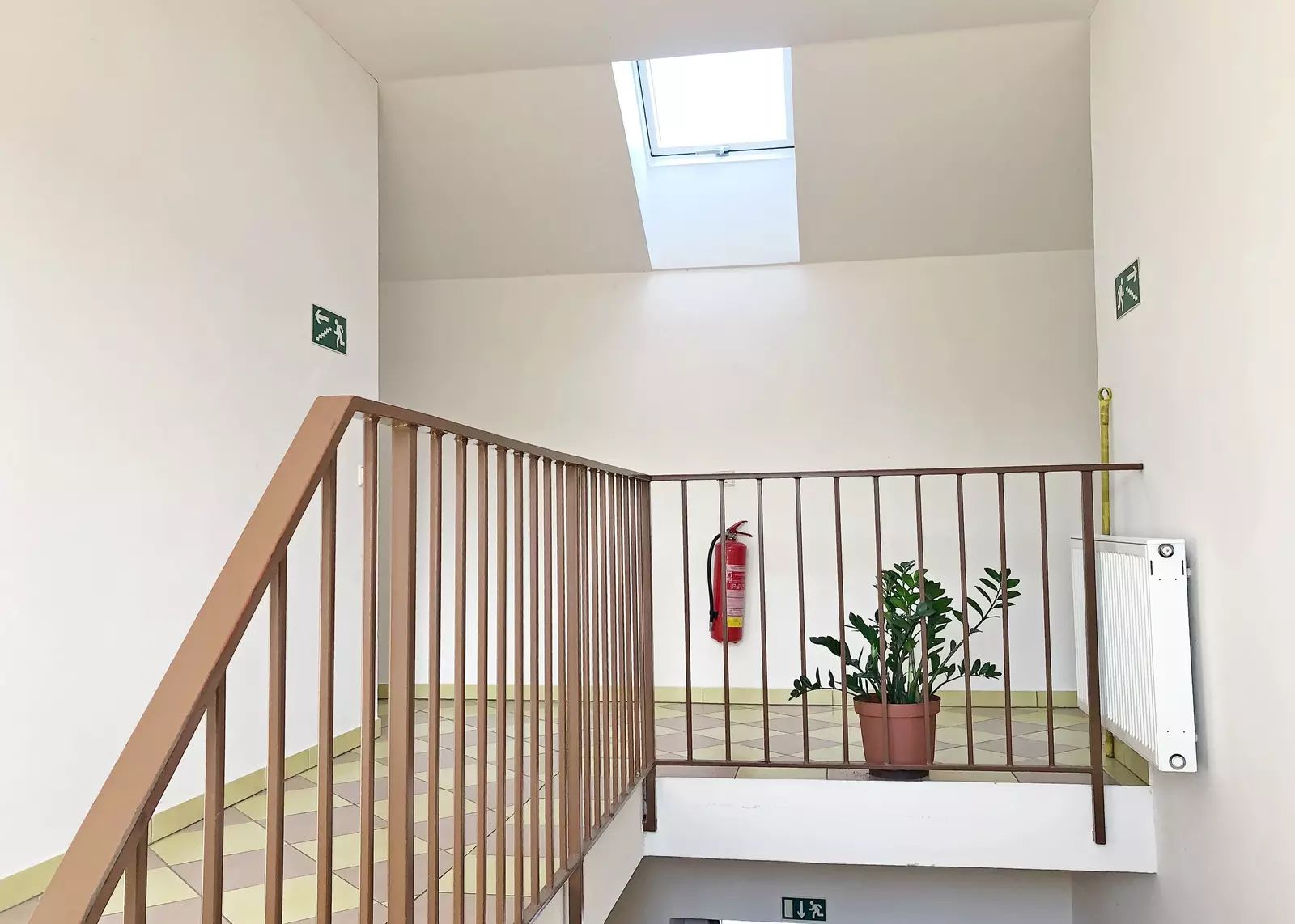 Dále je tu koupelna se sprchovým koutem, umyvadlem a toaletou. Závěsný elektrický bojler zajišťuje ohřev vody. Vytápění je řešeno centrálním kotlem na tuhá paliva.