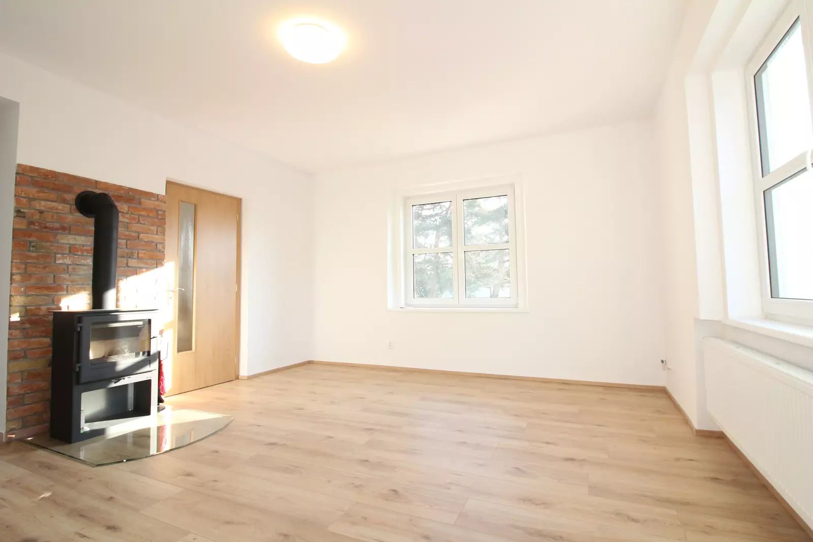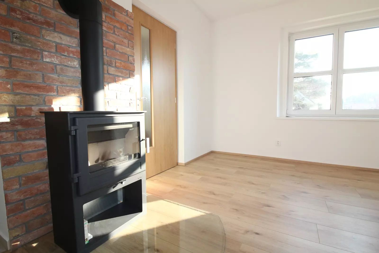 V 1. nadzemním podlaží se nachází prostorný obývací pokoj s krbem (krbové kamna budu instalovány v průběhu 14ti dnů). Dále je zde samostatná kuchyň vybavená moderní a plně zařízenou kuchyňskou linkou, s přímým vstupem na zahradu. Praktické dispoziční řešení doplňuje komora a samostatné WC. Vstup do prostorného sklepa, kde jsou velké prostory k uskladnění.