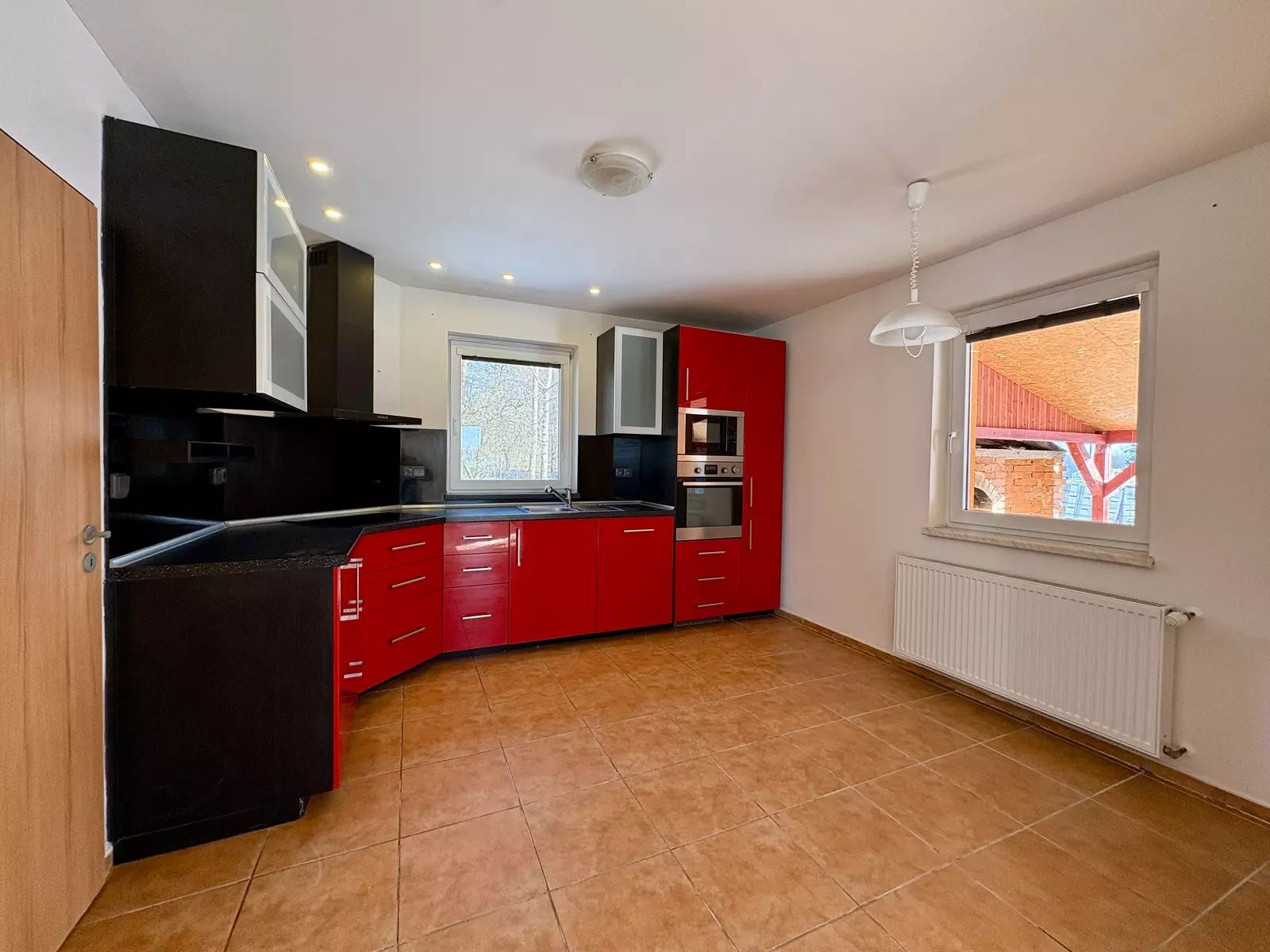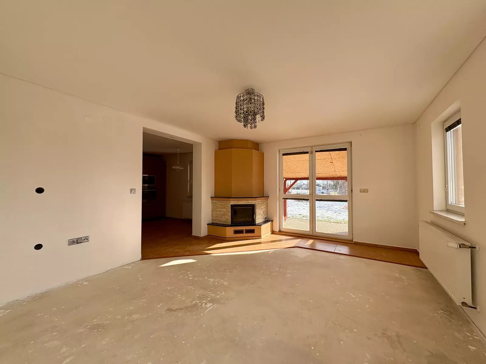 • Společenská zóna: Srdcem domu je prosluněný obývací pokoj (22 m²) s krbem a přímým vstupem na terasu, která v létě přirozeně rozšiřuje vnitřní prostor. Na obývací pokoj plynule navazuje kuchyně s jídelnou (12,6 m²).
