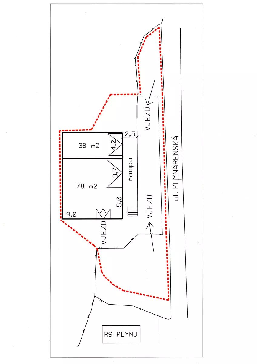 výška 5m, betonová rovná podlaha, rampa, možnost i bočního vjezdu do haly, příjezd k rampě ze dvou směrů i pro velké nákladní automobily, případně volná další plocha kolem haly, v těsné blízkosti nového nákupního centra.