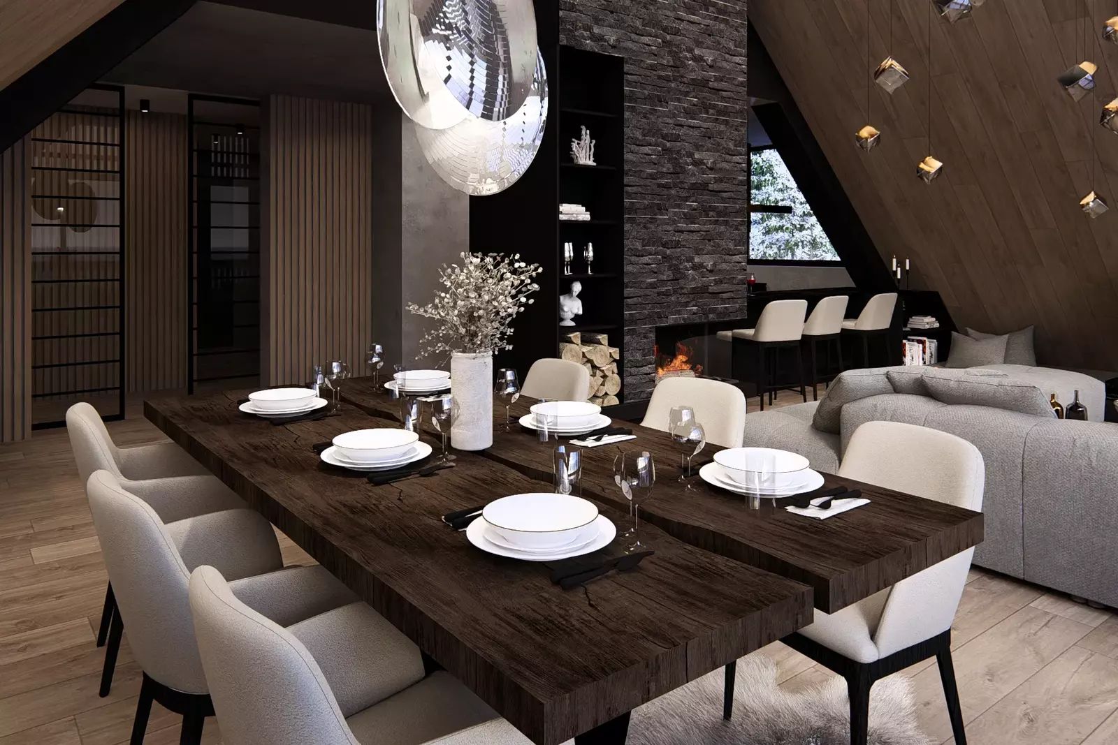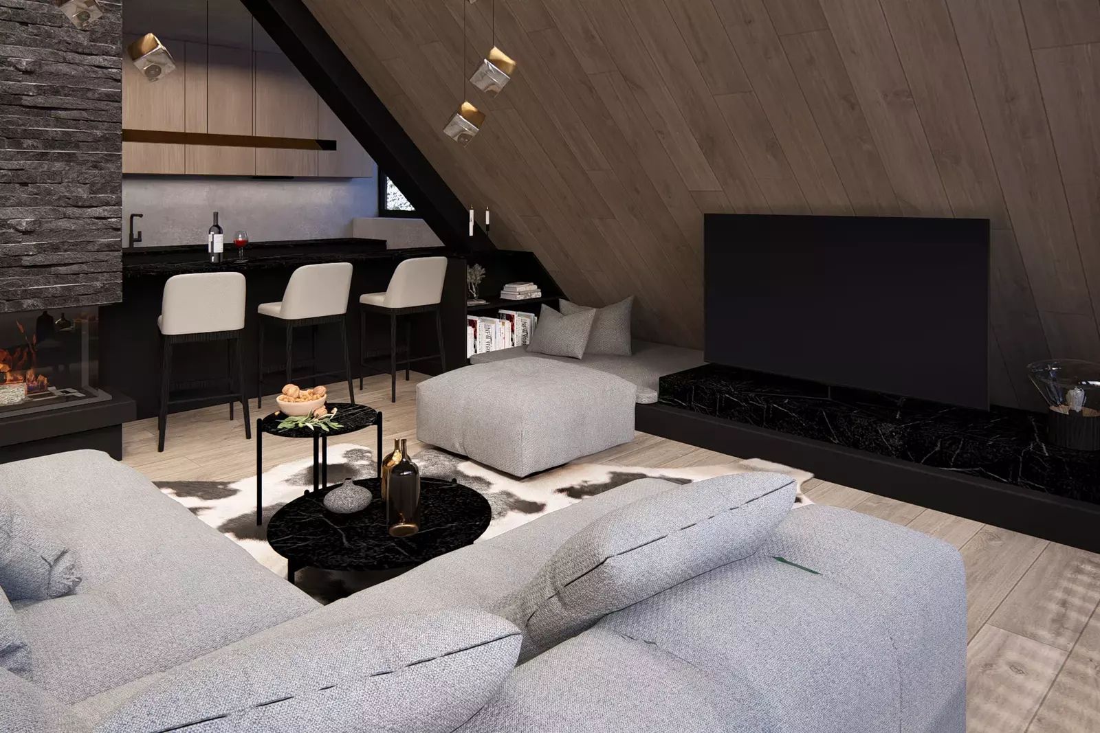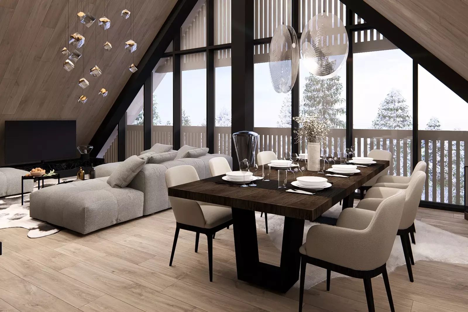 Dispozičně jednotka nabízí prostorný obývací pokoj s vysokými stropy, tři samostatné ložnice, tři koupelny s toaletami, šatnu a samostatnou saunu s jedinečným výhledem na sjezdovky. Z obývacího prostoru se otevírá dechberoucí panorama Krkonoš, které podtrhuje výjimečný charakter této nemovitosti. Dominantou obývacího pokoje bude klasický krb, jenž dotváří příjemnou horskou atmosféru a pocit útulného luxusu.