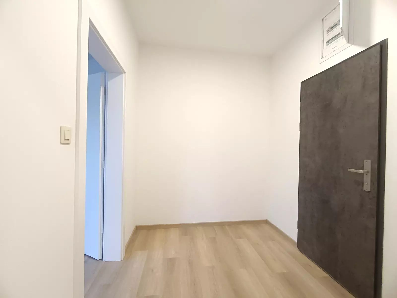 Za vstupními dveřmi je předsíň, ze které se vchází do koupelny se sprchovým koutem a toaletou, kuchyně spojené s obývacím pokojem, která je průchozí do ložnice. Kuchyňská linka je plně vybavena vestavěnými spotřebiči (el. sporák s troubou a sklokeramickou deskou, lednicí s mrazákem). V obývacím pokoji spojeném s kuchyní, ložnici a předsíni je na podlaze lepený vinil, v koupelně dlažba. K bytu patří sklepní kóje.