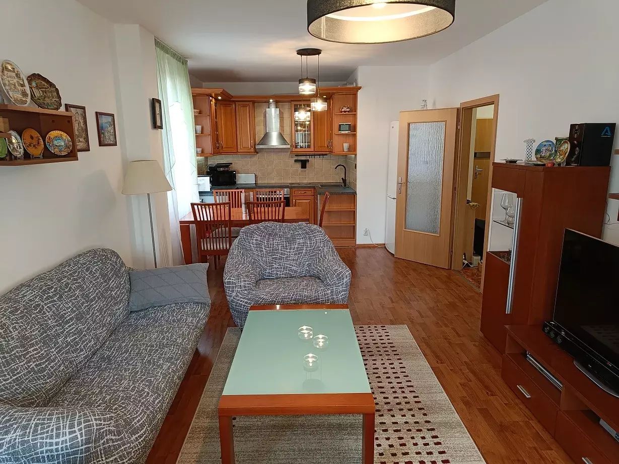 Obývací pokoj + KK (34,4 m²): Hlavní obytná část s plně vybavenou kuchyňskou linkou (včetně vestavné trouby a samostatné lednice) s přímým vstupem na terasu.