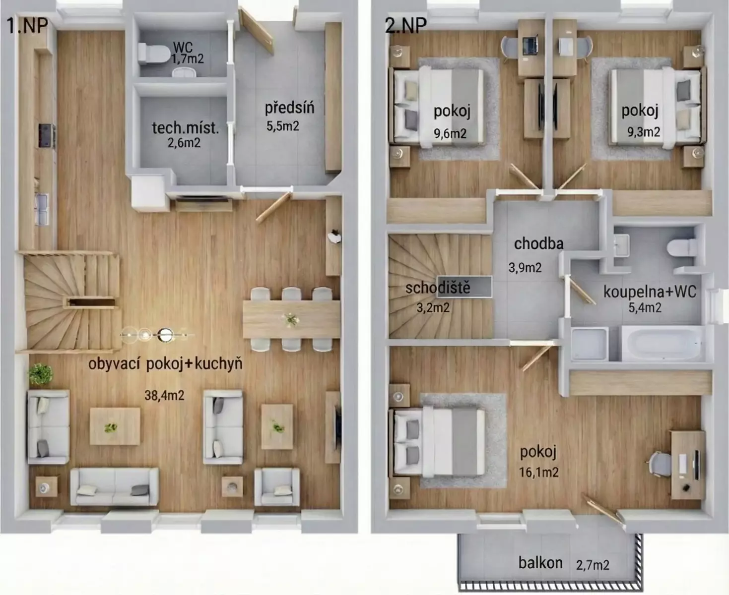 1. NP: Dominuje zde světlý obývací pokoj s kuchyňským koutem (38,4 m²), samostatné WC a praktická technická místnost.