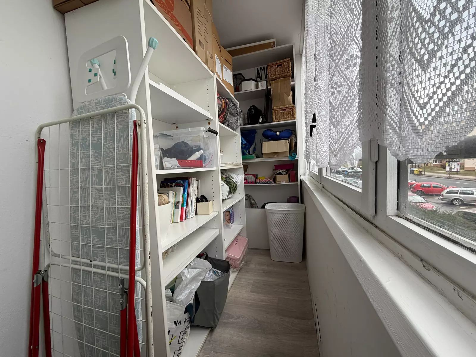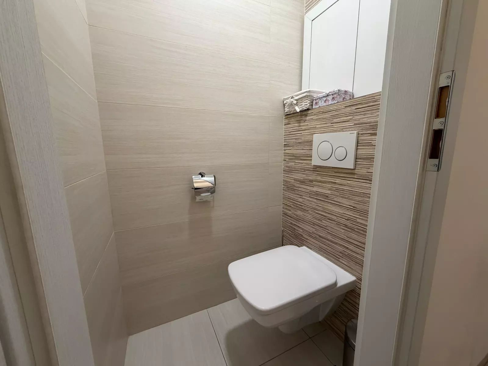Dispozice: chodba, koupelna se sprchovým koutem, pračkou, umyvadlem a elektrickým žebříčkem, samostatné WC, otevřený obývací pokoj, kuchyňský kout, komora, ložnice, pokoj a balkon. Celková plocha bytu: 63 m2.