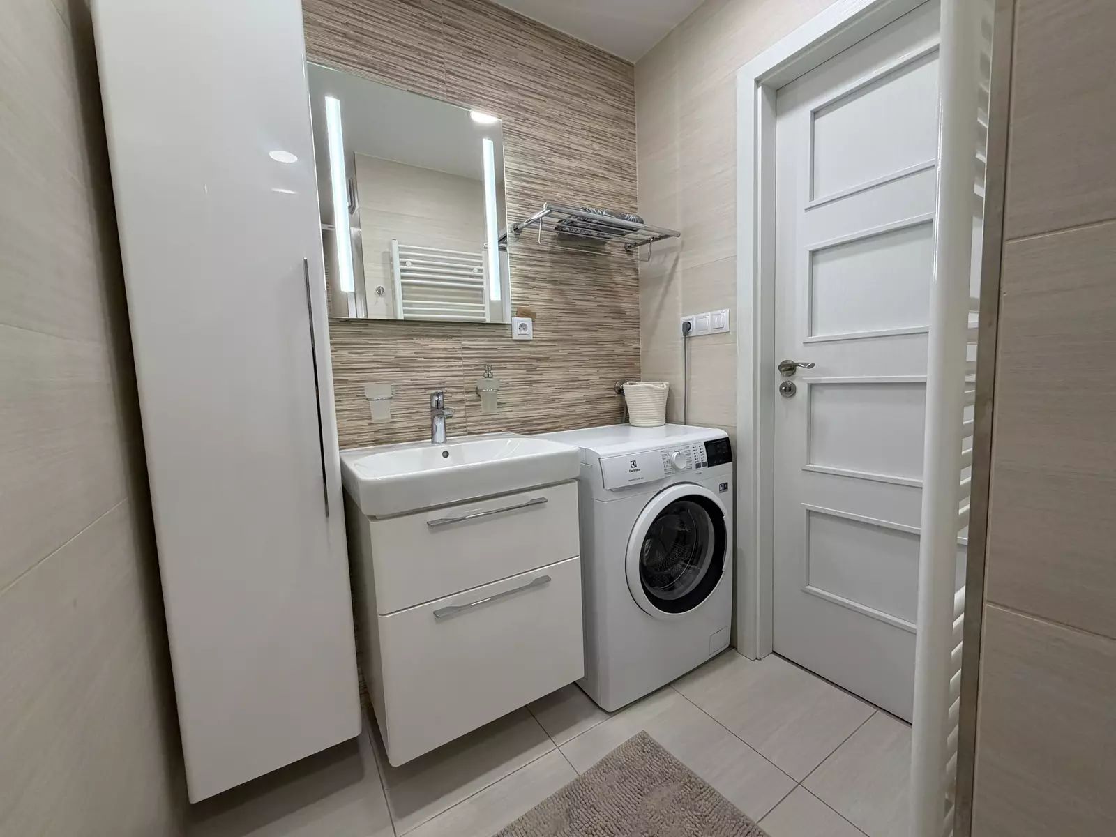 V koupelně – pračka. V obývacím pokoji – sedací souprava. V ložnici – postel.