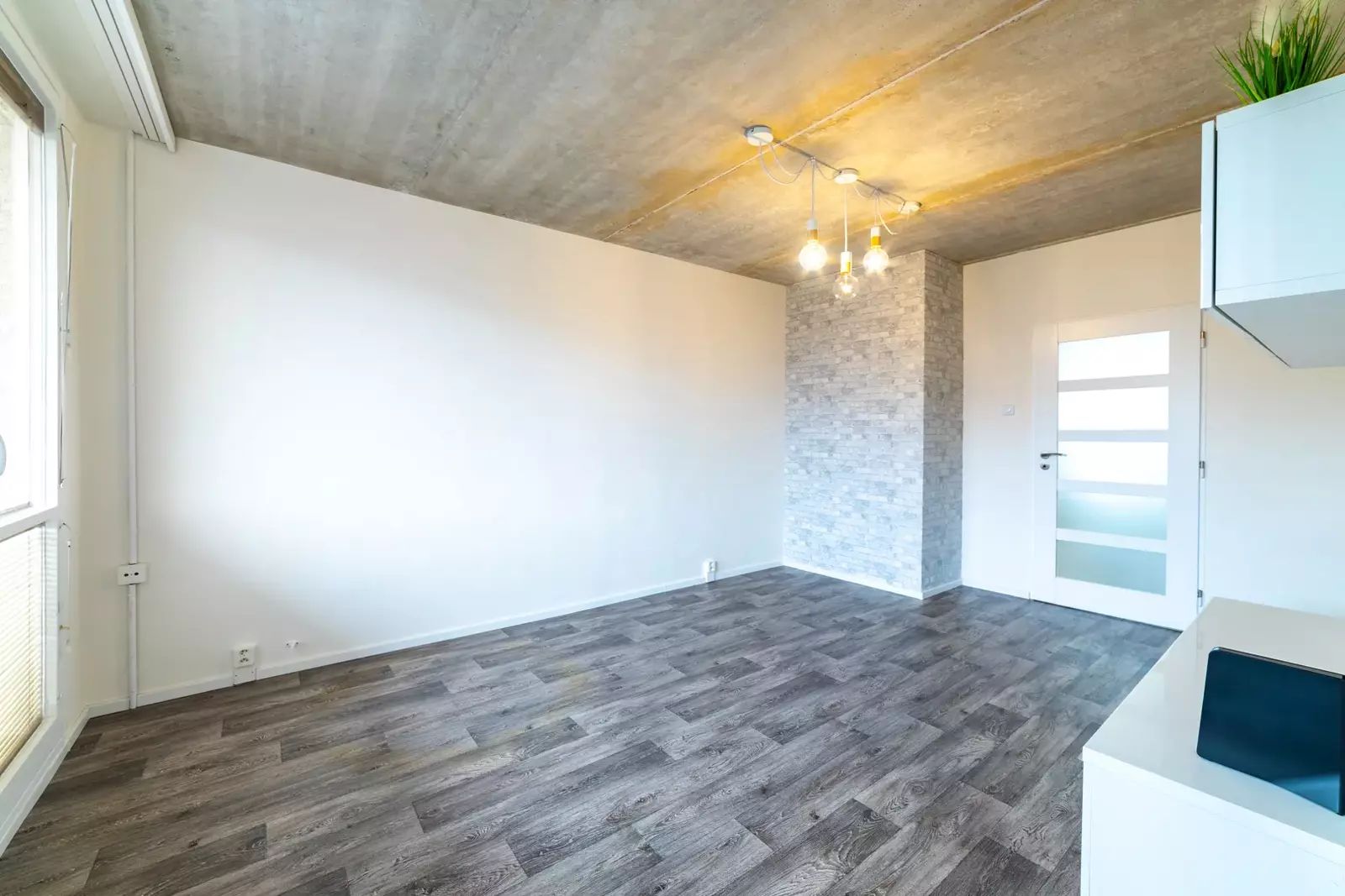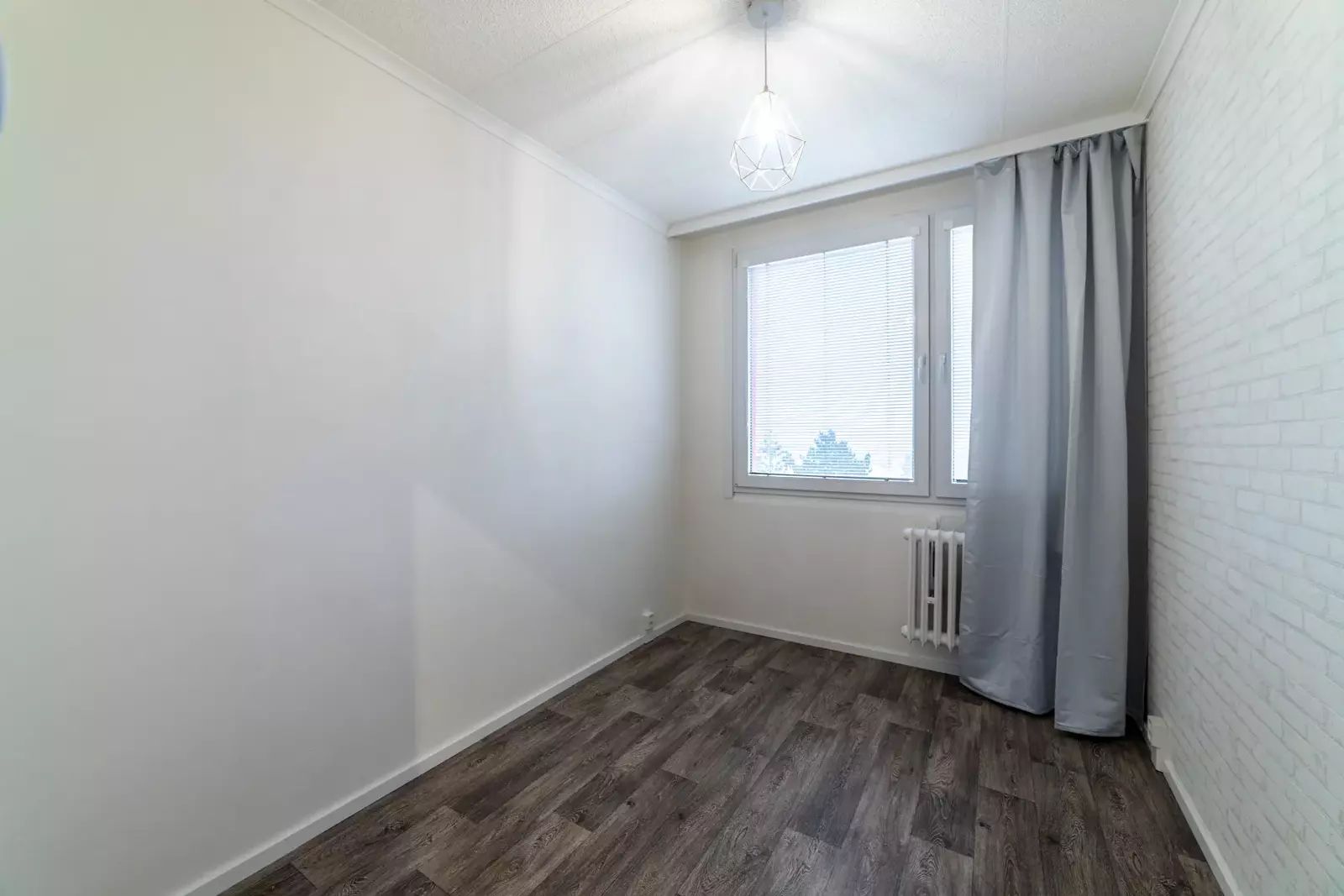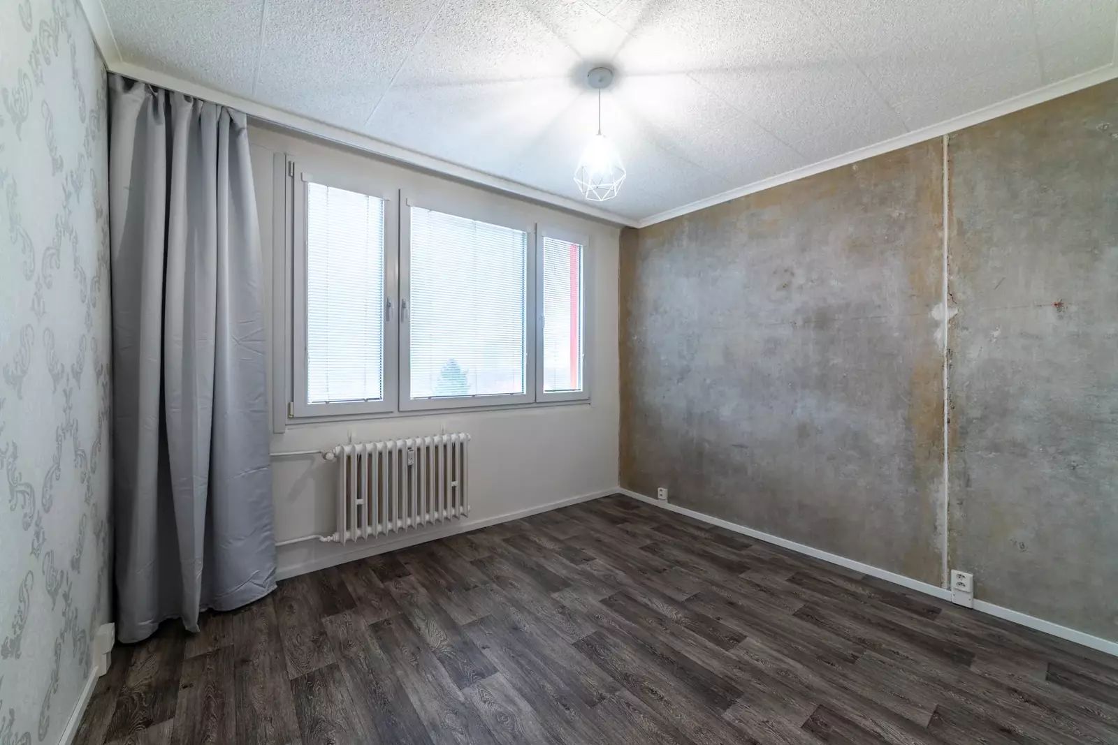Podlahy v bytě jsou plovoucí v dekoru dřeva a světle šedá dlažba, na oknech jsou žaluzie.