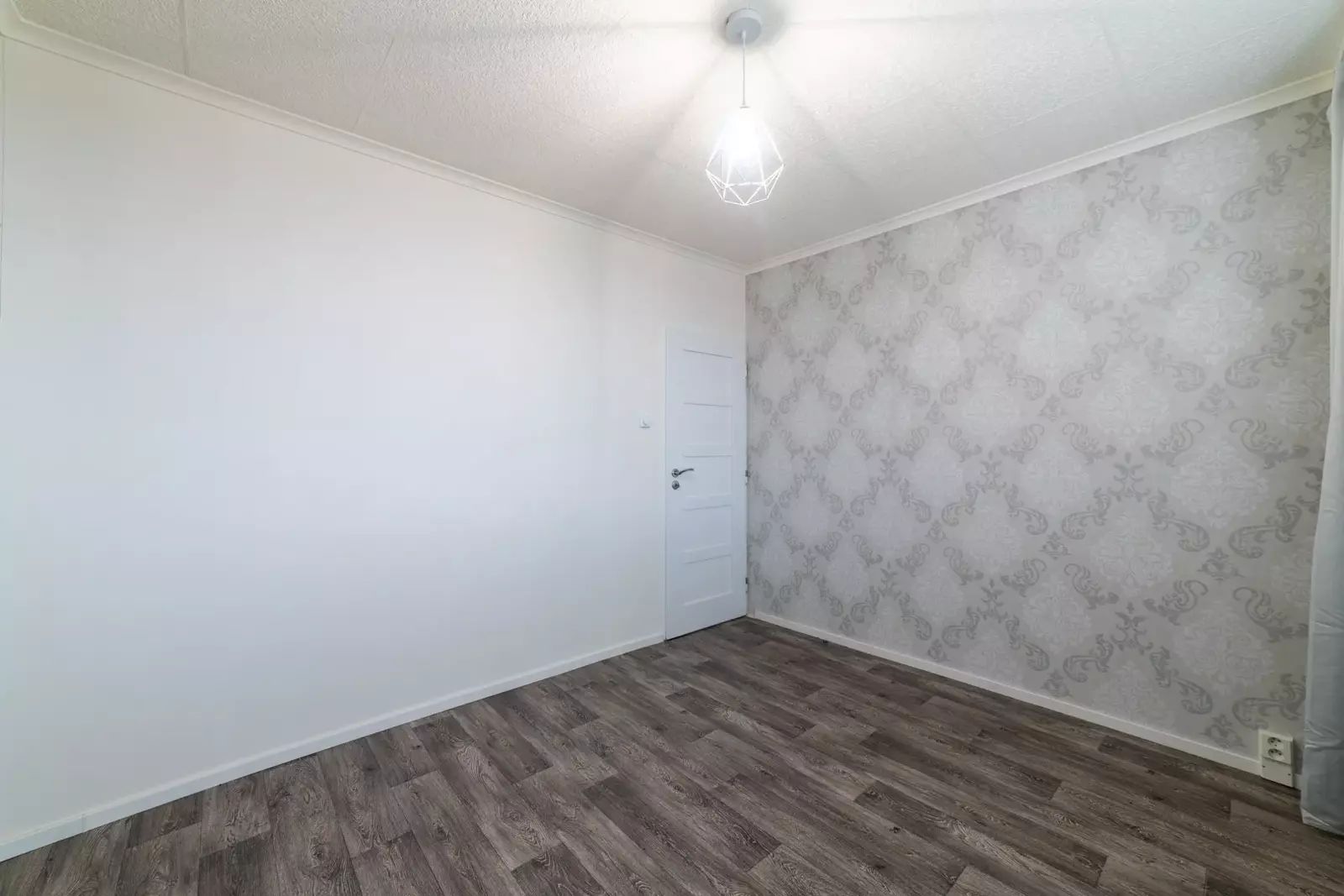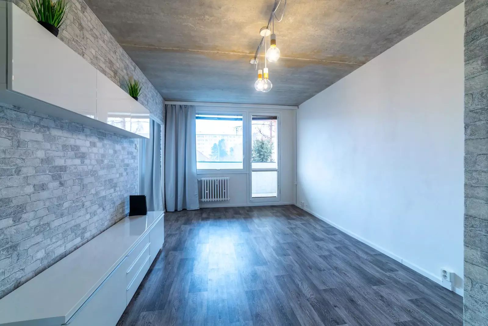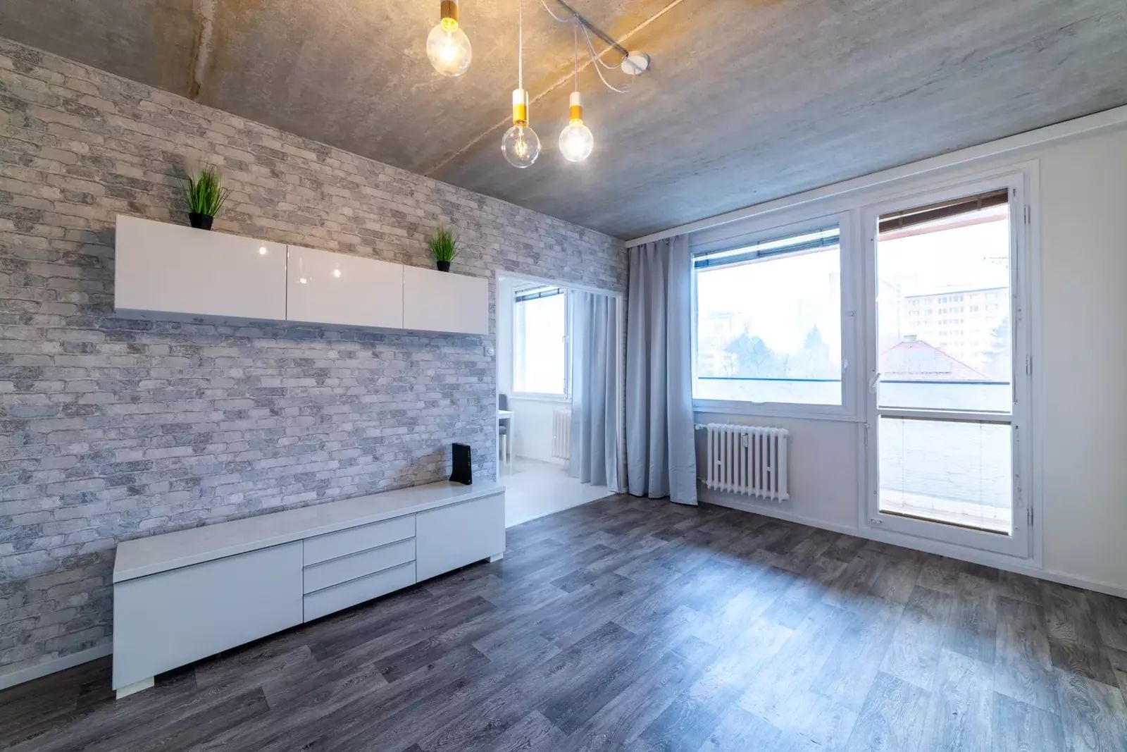 Podlahy v bytě jsou plovoucí v dekoru dřeva a světle šedá dlažba, na oknech jsou žaluzie.