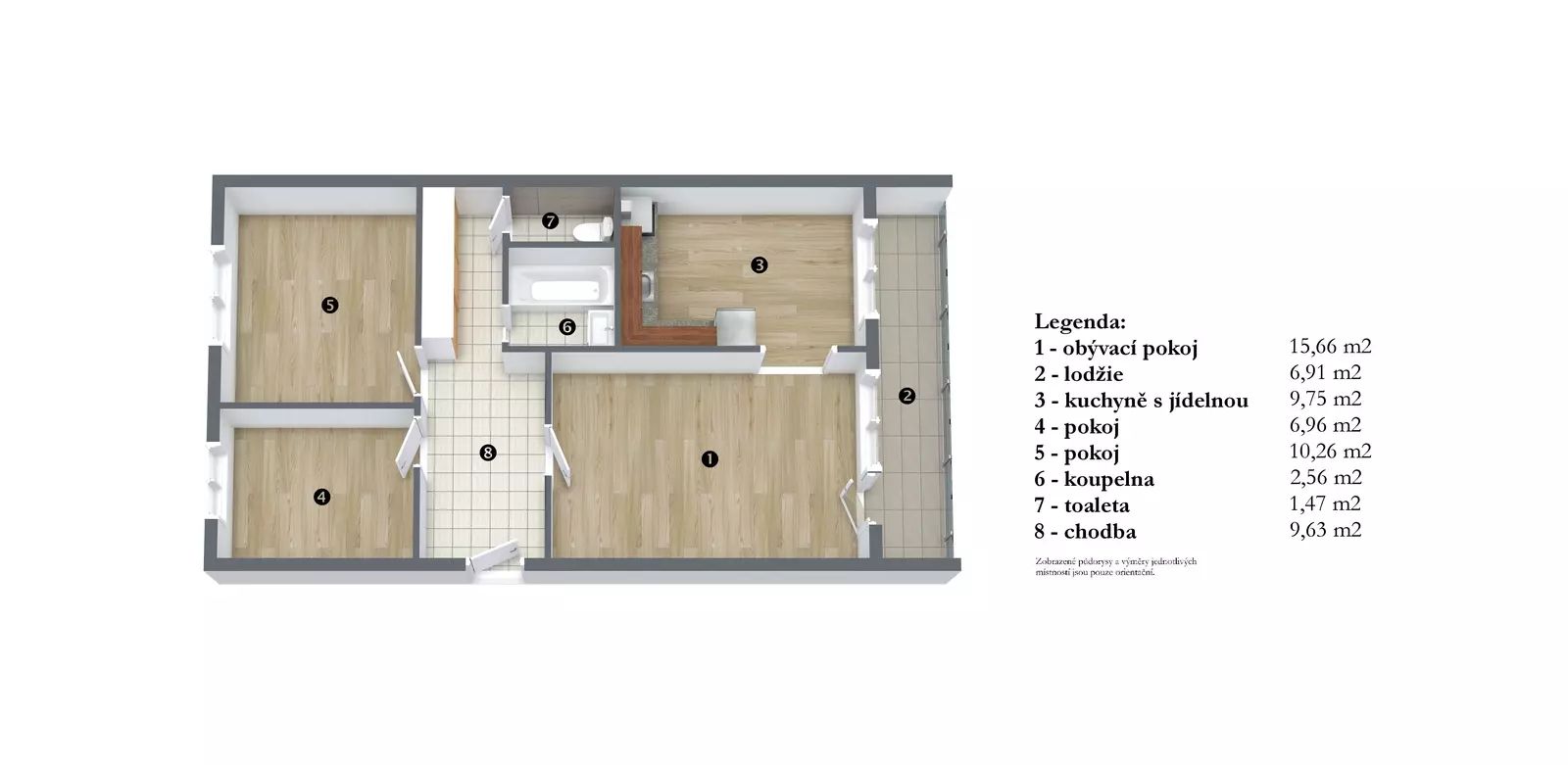 Obývací pokoj je dostatečně velký pro trávení společného času. Z obývacího pokoje je vstup na lodžii s výhledem do klidné části se zelení. Vedle obývacího pokoje se nachází prostorná kuchyň s jídelní částí. Kuchyňská linka je vybavena potřebnými spotřebiči (plyn. sporák, el. trouba, digestoř, lednice s mrazákem, myčka nádobí, mikrovlnná trouba). Kuchyň Vás potěší dostatkem denního světla a prostorem pro vaření. Byt rozděluje praktická, dlouhá chodba s několika vestavěnými skříněmi a policemi. V chodbě jsou velmi dobře řešeny úložné prostory. Z chodby jsou vstupy do dvou neprůchozích pokojů, vstup na samostatnou toaletu a do koupelny s vanou. Koupelna je vybavena pračkou.