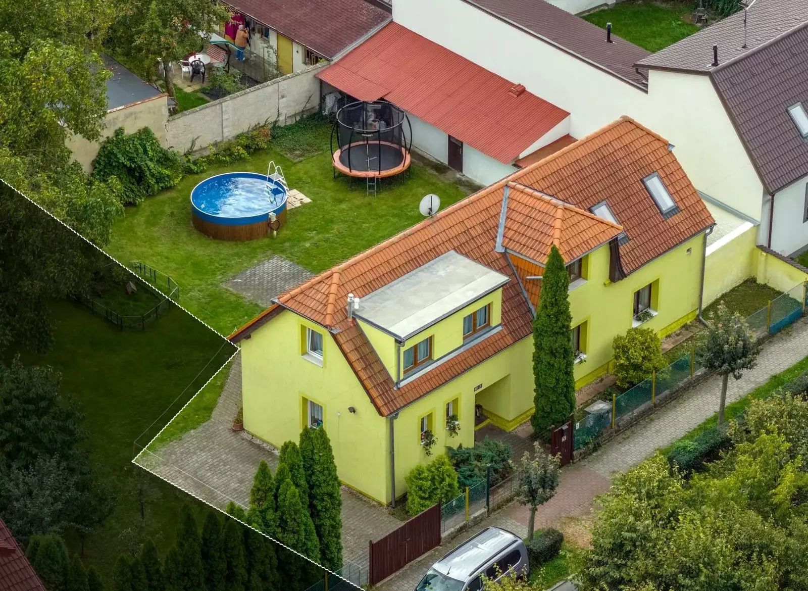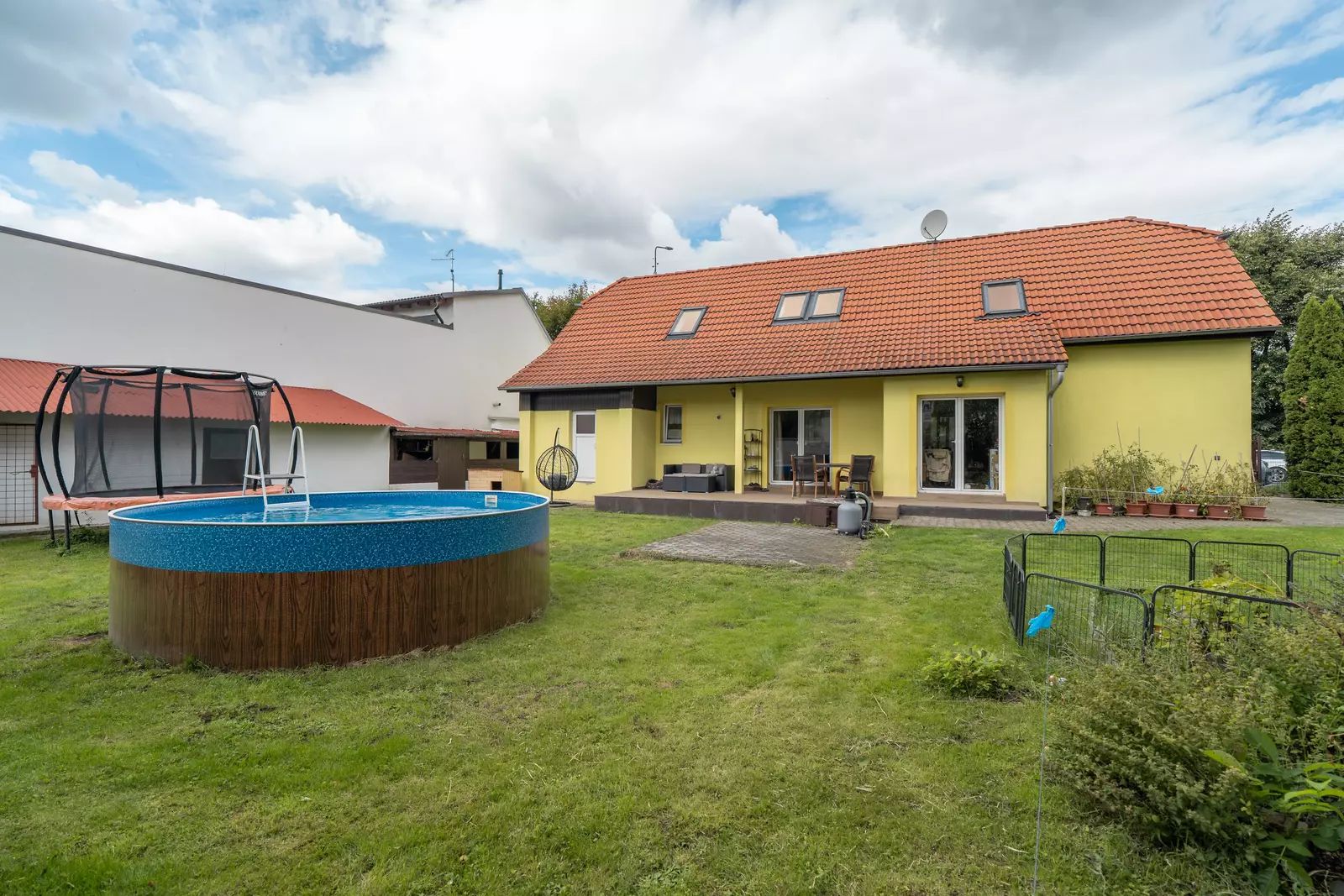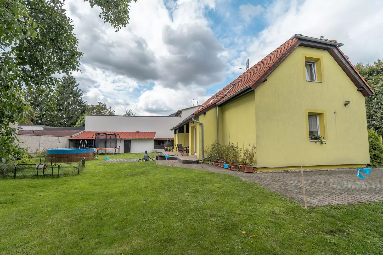 Na zahradu se vejde bazén i trampolína, kutilové ocení zděnou vedlejší stavbu, kde se dá montovat, opravovat, skladovat, schovávat se před manželkou, parkovat motorku, lyže, nebo psa… Prostě prostor pro široké využití. Na zahradě je i původní studna, takže napouštění bazénu nemusí být až tak nákladné.