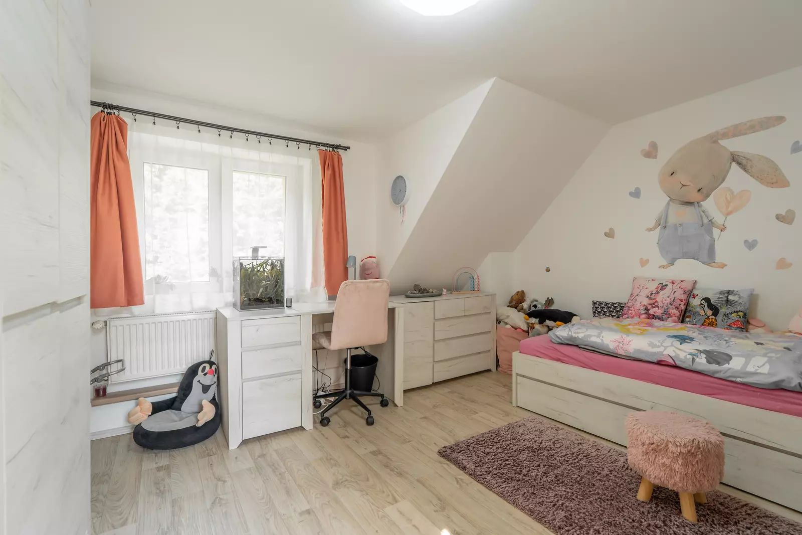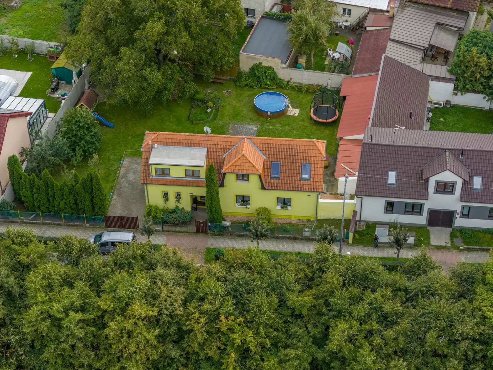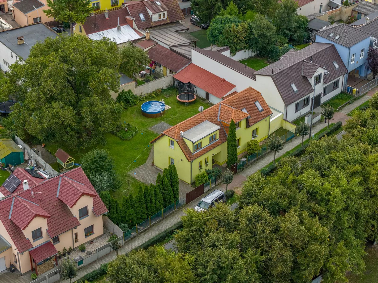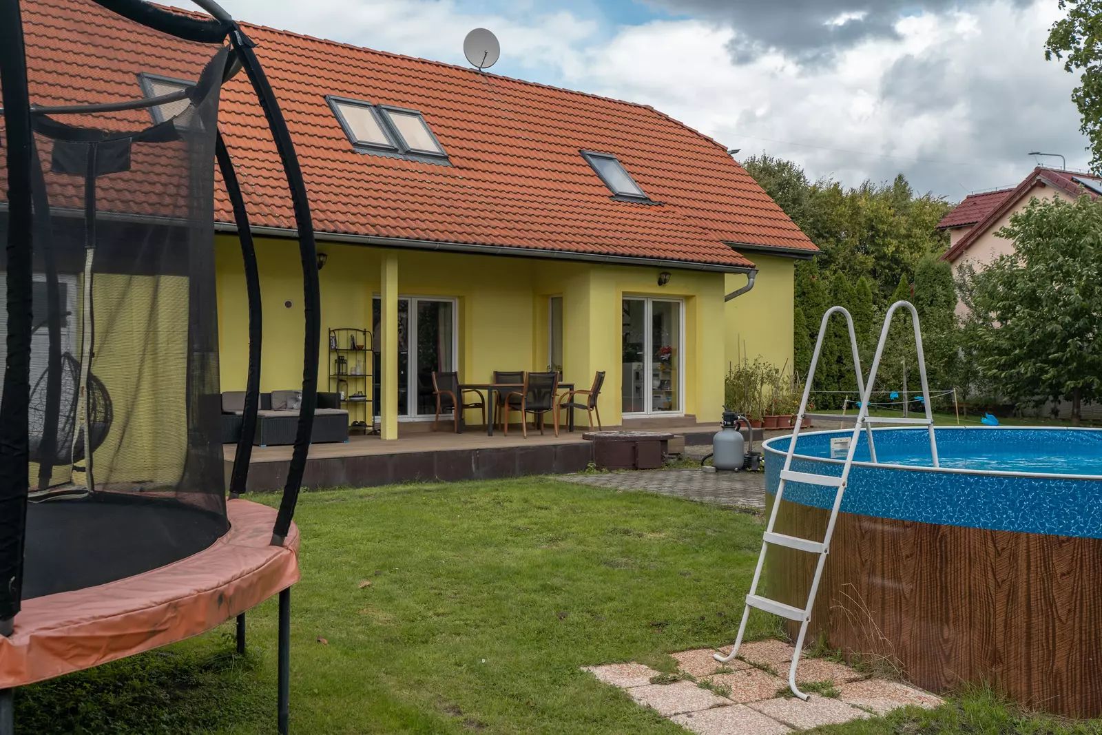 Na zahradu se vejde bazén i trampolína, kutilové ocení zděnou vedlejší stavbu, kde se dá montovat, opravovat, skladovat, schovávat se před manželkou, parkovat motorku, lyže, nebo psa… Prostě prostor pro široké využití. Na zahradě je i původní studna, takže napouštění bazénu nemusí být až tak nákladné.