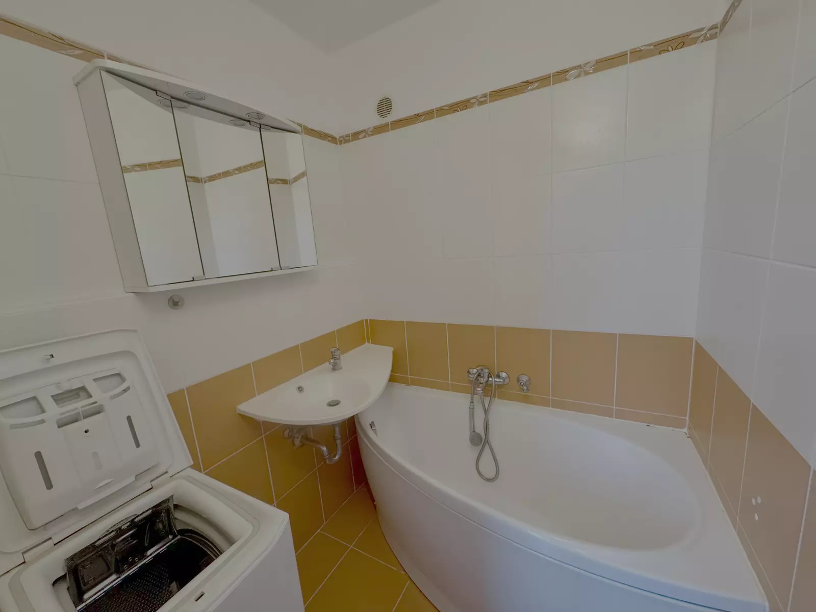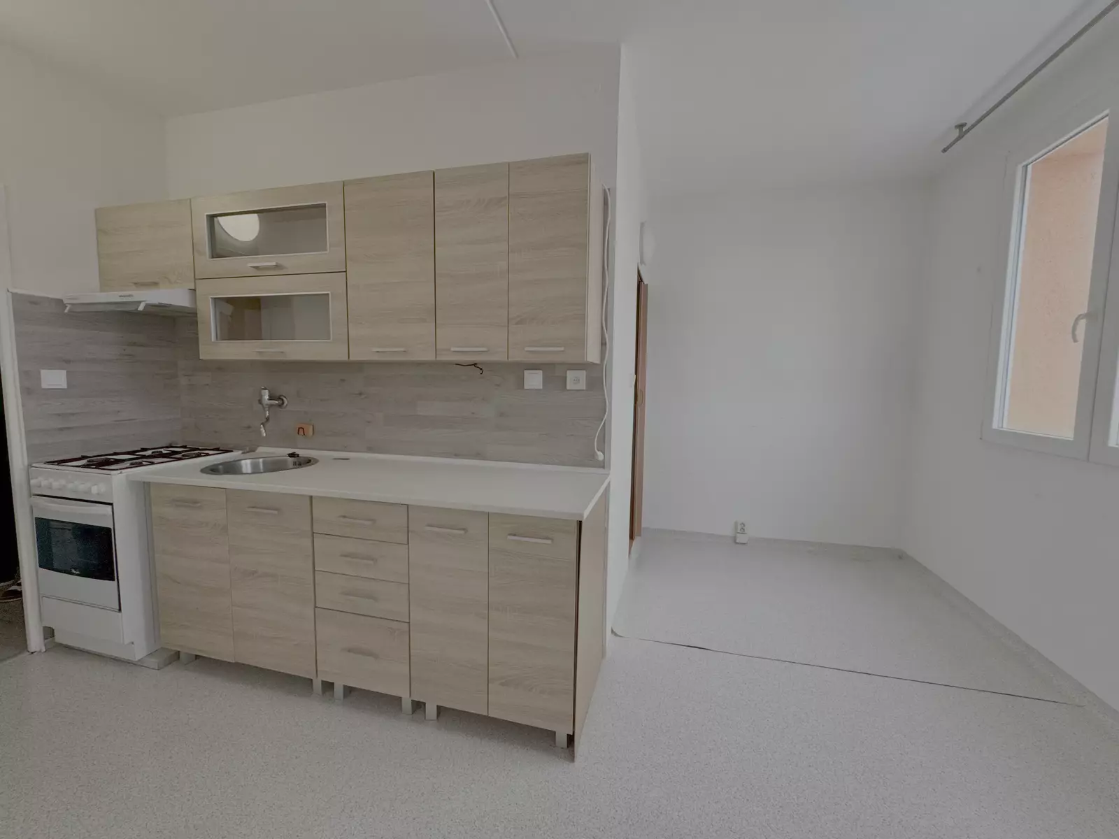 Byt je nezařízený, vybaven pouze kuchyňskou linkou a pračkou, což umožňuje nájemníkovi upravit si prostor podle vlastních potřeb.