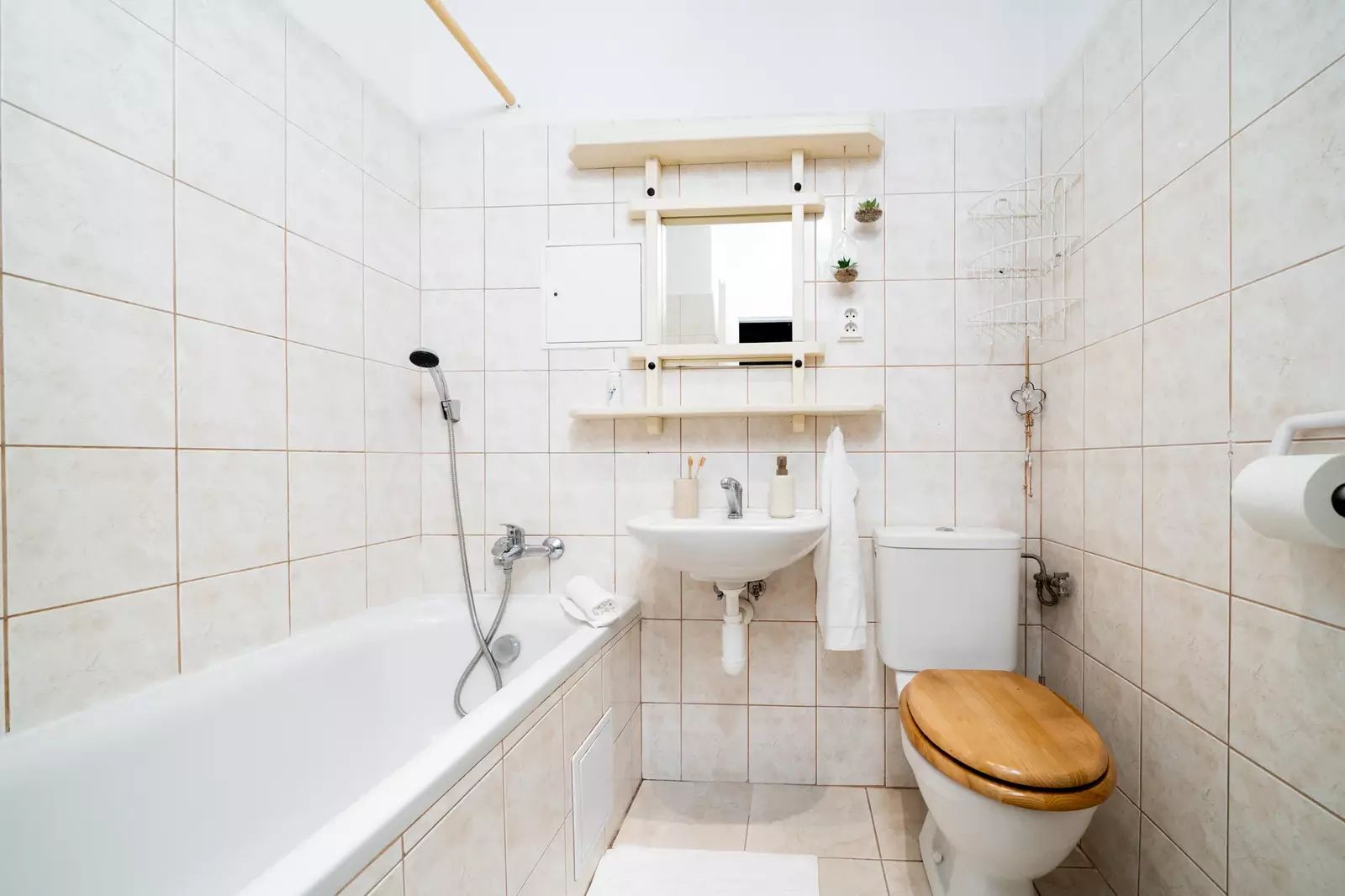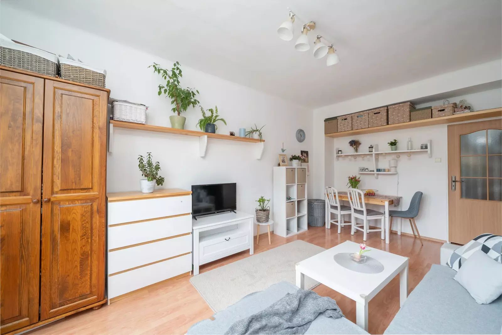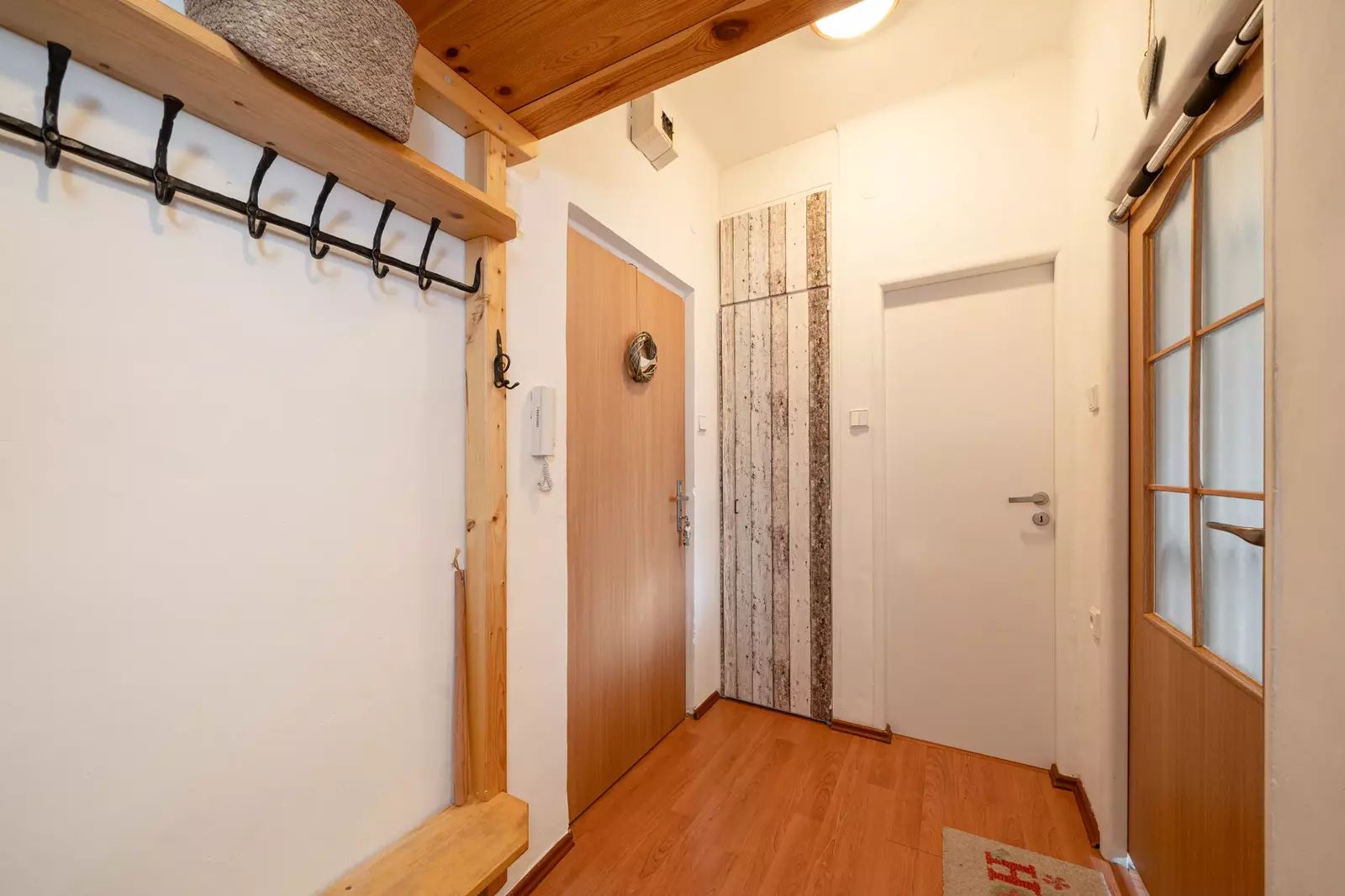 Po vstupu do bytu se ocitnete v chodbě s možností ukládání oblečení, tak aby vše bylo po ruce. Z této chodby se dostanete do koupelny s vanou a WC a dále do pokoje s lodžií a s kuchyňským koutem. Na tento pokoj navazuje malá samostatná ložnice. K bytu dále patří samostatná komora na patře bytu, kterou využijete pro uskladnění sportovního vybavení.