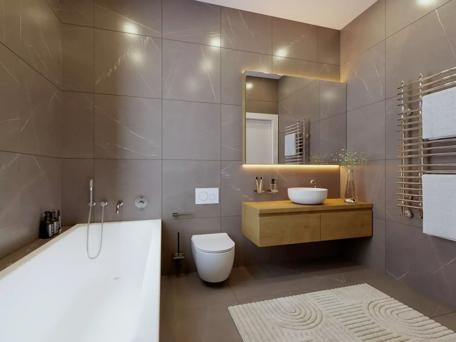 Provedení bytu je ve vysokém standardu, 3 vrstvé podlahy z pravého dubového dřeva v obytných místnostech, koupelna s velkoformátovými keramickými obklady italské značky Del Conca. Součástí vybavení koupelny je také žebříkový radiátor a zařizovací předměty značky Vitra a Grohe.