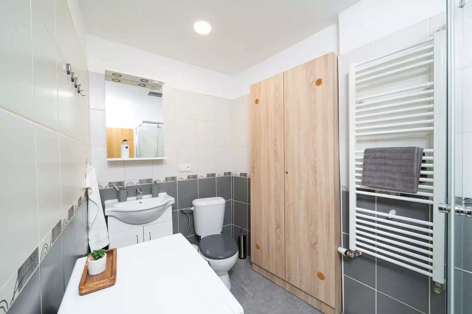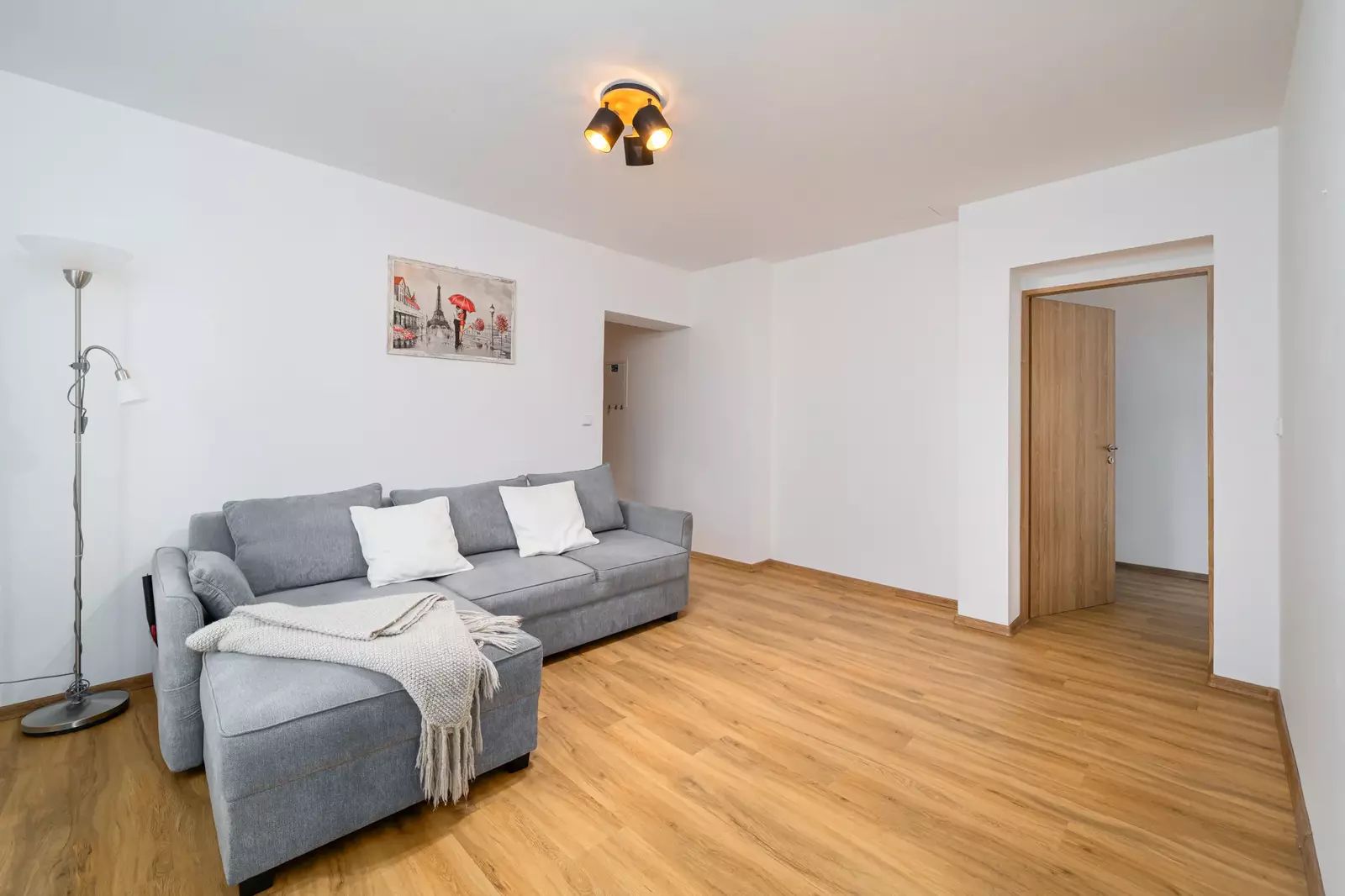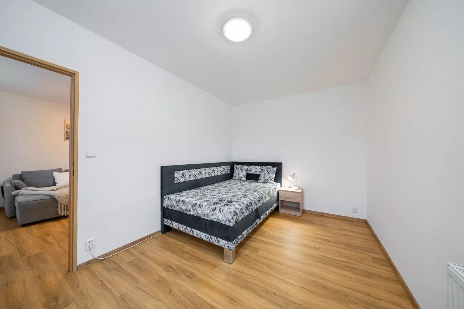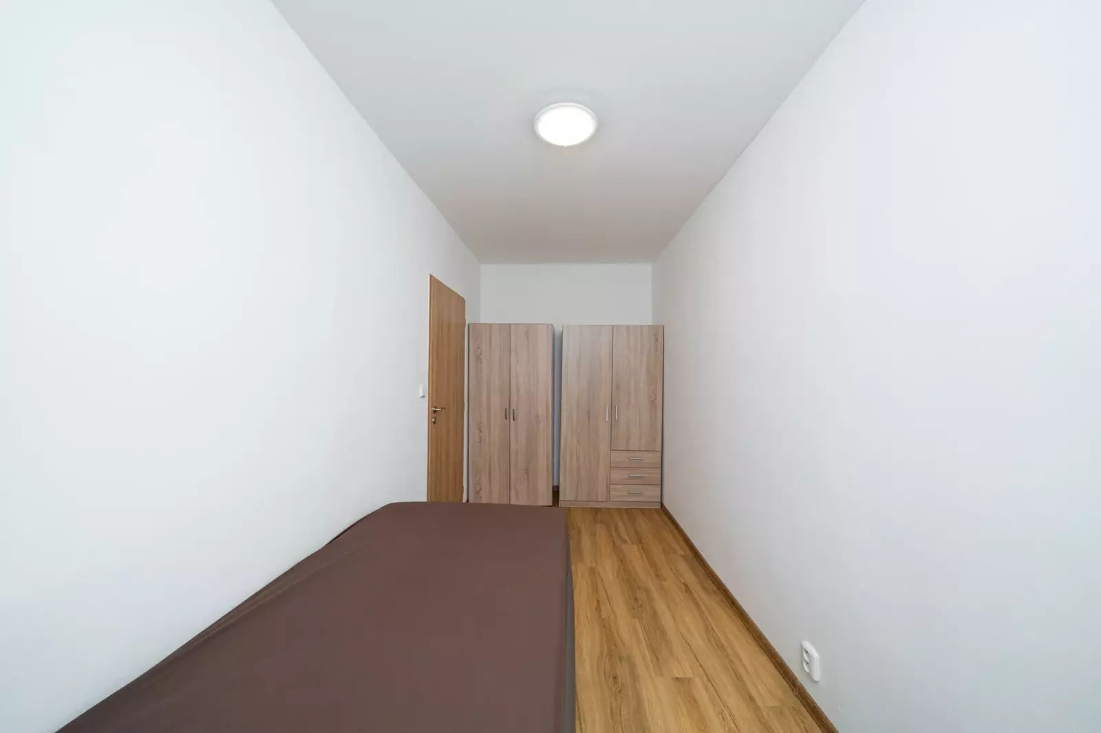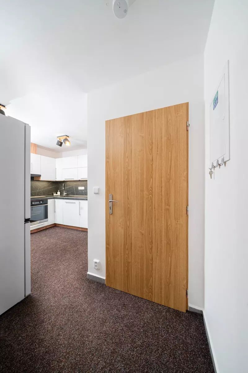 Dispozice bytu: po vstupu do bytu se ocitnete v chodbě. Z této chodby se postupně dostanete do pokoje s kuchyňským koutem, dále do koupelny s WC a sprchovým koutem a následně do obývacího pokoje a dvou samostatných neprůchozích pokojů.
