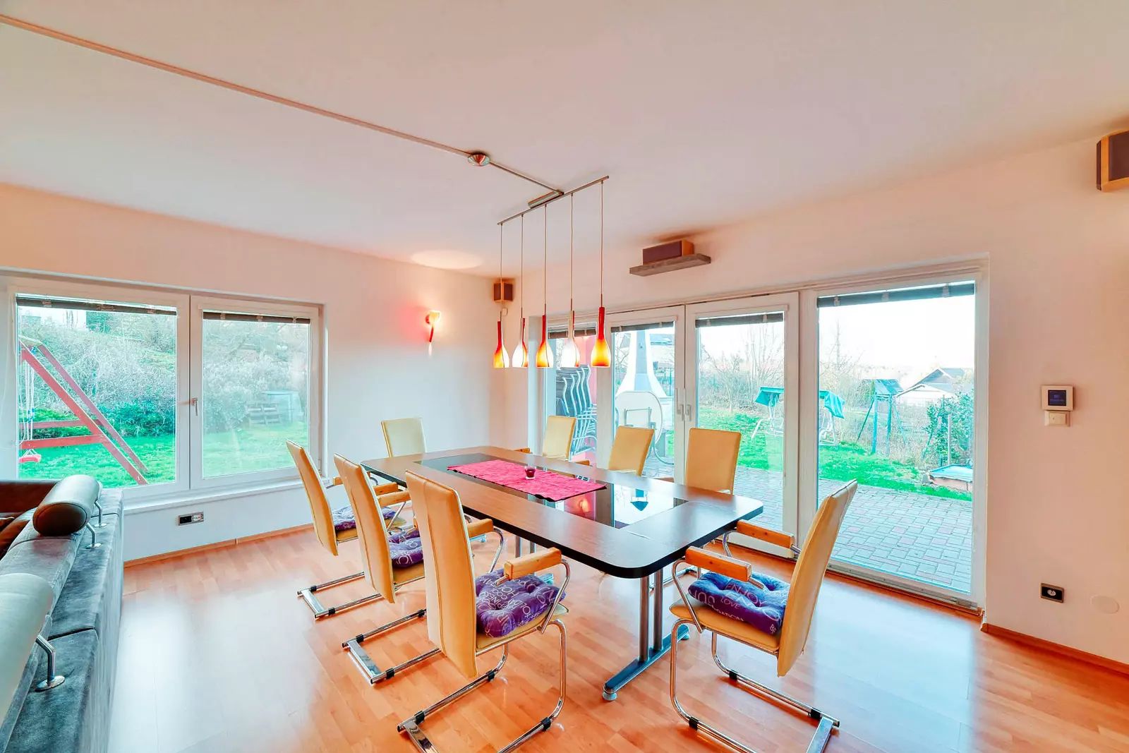 Zahrada domu je založena zejména k volnému pohybu dětí, pro bazén a sport, jsou zde i ovocné stromy.